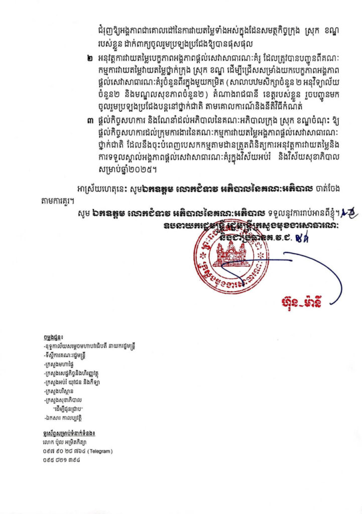 ភ្នំពេញ៖ក្រសួងមុខងារសាធារណៈ ចេញសេចក្តីណែនាំ ដល់អភិបាលនៃគណៈអភិបាលរាជធានី ខេត្ត ផ្សព្វផ្សាយ​​ ជូនដំណឹង និងជ្រើសរើសអង្គភាពផ្តល់សេវាសាធារណៈគំរូក្នុងវិស័យអប់រំ និងក្នុងវិស័យសុខាភិបាល ឆ្នាំ២០២៥ ក្នុងមូលដ្ឋានរបស់ខ្លួនដើម្បីចូលរួមប្រកួតប្រជែងនៅថ្នាក់ជាតិ៕