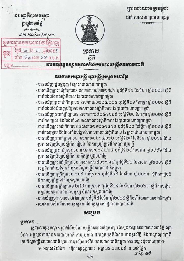 សូមបញ្ជាក់ជូនសាធារណជនឲ្យបានជ្រាបថា ៖អនុវត្តតាមគោលការណ៍ដឹកនាំ បញ្ជា របស់ឯកឧត្តម ឧត្តមសេនីយ៍ឯក ជួន ណារិន្ទ អគ្គស្នងការរង និងជាស្នងការនគរបាលរាជធានីភ្នំពេញ រាល់មន្ត្រីនៃស្នងការដ្ឋាននគរបាលរាជធានីភ្នំពេញ ដែលបំពេញភារកិច្ច អនុវត្តការងារ គ្មានវិន័យ ខ្វះក្រមសីលធម៌ វិជ្ជាជីវៈនគរបាលជាតិ ដែលបានស្រាវជ្រាវរកឃើញពិតជាប្រព្រឹត្តល្មើសវិន័យនគរបាលជាតិ គឺស្នងការដ្ឋាននគរបាលរាជធានីភ្នំពេញមិនដែលទុកចោលនោះទេ ត្រូវអនុវត្តវិធានការតាមគោលការណ៍ច្បាប់របស់កងកម្លាំងនគរបាលជាតិ ជាក់ស្តែងស្នើសុំគោលការណ៍អគ្គស្នងការដ្ឋាននគរបាលជាតិ ក្រសួងមហាផ្ទៃ អនុវត្តវិន័យរបស់កងកម្លាំងនគរបាលជាតិជាបន្តបន្ទាប់មកហើយ ដោយអនុវត្តក្រោមរូបភាពកម្រិតកំហុសឆ្គងរួមមាន៖ការអប់រំនិងធ្វើកិច្ចសន្យា ,ការបញ្ឈរជើងផ្អាកការងារបណ្តោះអាសន្ន ,ការចេញលិខិតព្រមានលើកទី១ ,ការកាត់បន្ថយឋាន្តរស័ក្តិ ដកហូតមុខដំណែង ប្ញផ្ទេរភារកិច្ច និងការបណ្តេញចេញពីក្របខណ្ឌនគរបាលជាតិ៕