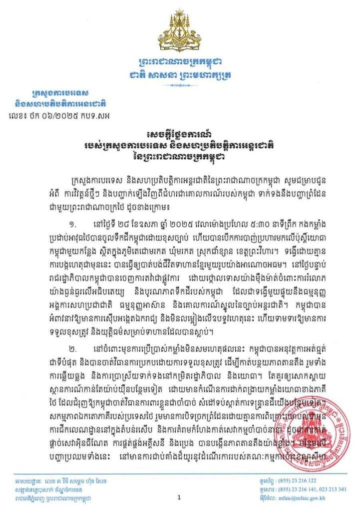 ភ្នំពេញ៖ក្រសួងការបរទេស និងសហប្រតិបត្តិការអន្តរជាតិ នៃព្រះរាជាណាចក្រកម្ពុជា នៅថ្ងៃទី៥ ខែកក្កដា ឆ្នាំ២០២៥នេះ បានសេចក្តីថ្លែងការណ៍ចំនួន៨ចំណុច អំពីការវិវត្តន៍ថ្មីៗ និងបញ្ជាក់ឡើងវិញពីជំហរជាគោលការណ៍របស់កម្ពុជា ទាក់ទងនឹងបញ្ហាព្រំដែនជាមួយព្រះរាជាណាចក្រថៃ។
