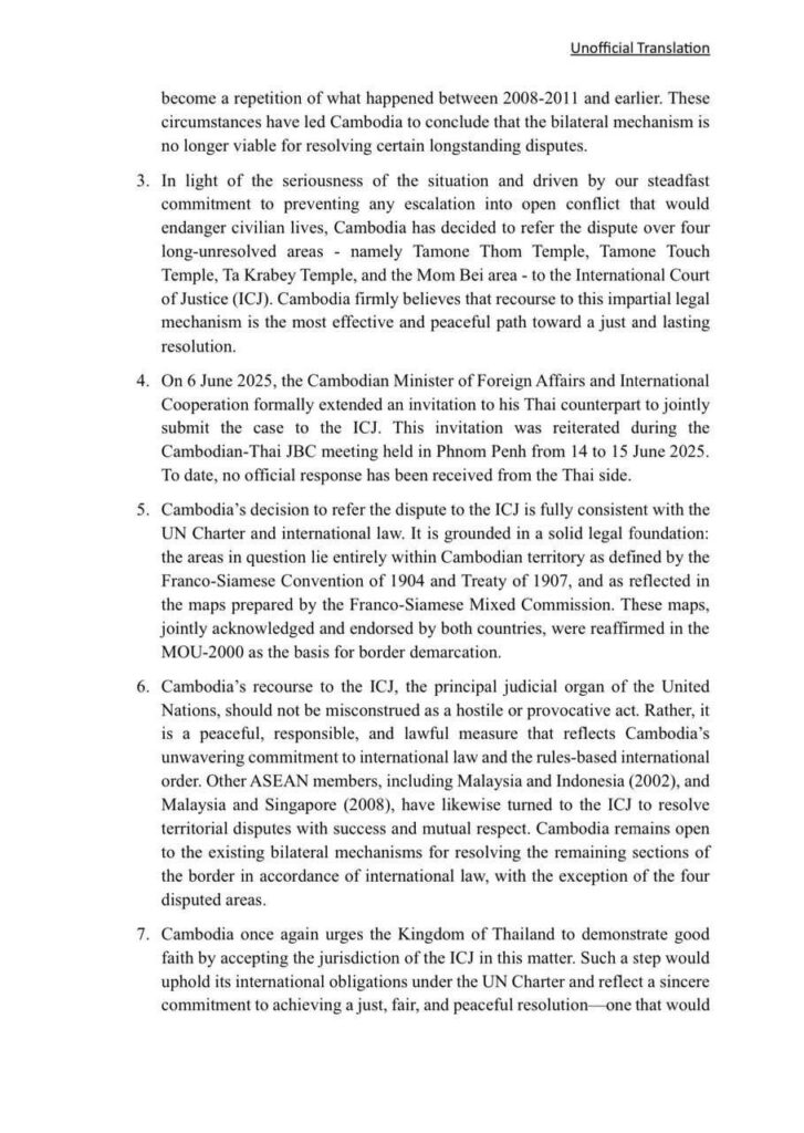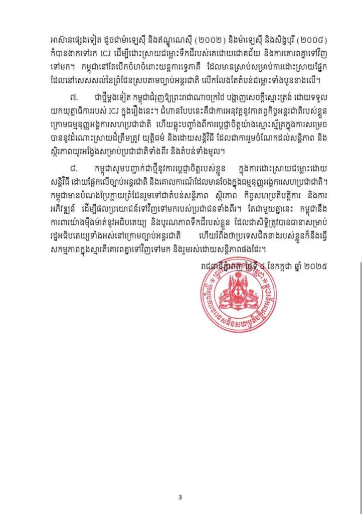ទី៦៖ សំណើរបស់កម្ពុជាទៅកាន់ ICJ ដែលជាស្ថាប័នតុលាការចម្បងរបស់អង្គការសហប្រជាជាតិ មិនគួរត្រូវបានយល់ខុសថាជាអំពើអរិភាព ឬការបង្កហេតុនោះទេ។ ផ្ទុយទៅវិញ វាគឺជាវិធានការតាមសន្តិវិធីប្រកបដោយការទទួលខុសត្រូវ និងស្របច្បាប់ដែលឆ្លុះបញ្ចាំងពីការប្តេជ្ញាចិត្តដោយឥតងាករេរបស់កម្ពុជាចំពោះច្បាប់អន្តរជាតិ និងសណ្តាប់ធ្នាប់អន្តរជាតិដែលផ្អែកលើច្បាប់។