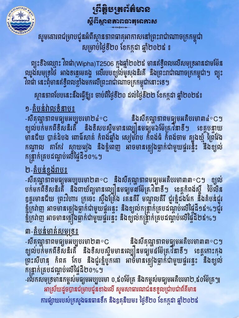 ភ្នំពេញ៖ក្រសួងធនធានទឹក និងឧតុនិយម បានចេញសេចក្តីជូនដំណឹង អំពីស្ថានភាពធាតុអាកាសនៅកម្ពុជា សម្រាប់ថ្ងៃទី២០ ខែកក្កដា ឆ្នាំ២០២៥។