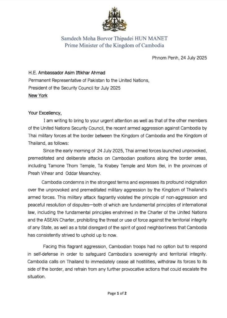ភ្នំពេញ៖សម្តេចមហាបវរធិបតី ហ៊ុន ម៉ាណែត នាយករដ្ឋមន្រ្តីនៃកម្ពុជា នៅថ្ងៃទី២៤ ខែកក្កដា ឆ្នាំ២០២៥នេះ បានលិខិតផ្ញើជូន លោក Asim Iftikhar Ahmad ប្រធានប្តូរវេនក្រុមប្រឹក្សាសន្តិសុខអង្គការសហប្រជាជាតិ សម្រាប់ខែកក្កដា ឆ្នាំ២០២៥ ស្នើសុំកោះប្រជុំក្រុមប្រឹក្សាសន្តិសុខជាបន្ទាន់ ដើម្បីសុំការអន្តរាគមន៍បញ្ចប់ការឈ្លានពានរបស់កងទ័ពថៃមកលើដែនអធិបតីភាពករបស់កម្ពុជា៕