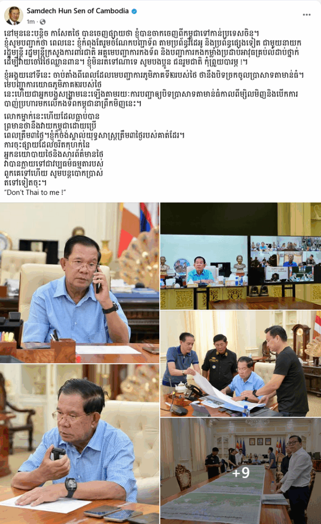ខាងក្រោមជាខ្លឹមសារទាំងស្រុងរបស់សម្តេចតេជោ ហ៊ុន សែន៖នៅមុននេះបន្តិច កាសែតថៃ បានចេញផ្សាយថា ខ្ញុំបានចាកចេញពីកម្ពុជាទៅកាន់ប្រទេសចិន។សម្ដេចតេជោ ខ្ញុំសូមបញ្ជាក់ថា ពេលនេះ ខ្ញុំកំពុងតែរួមចំណែកបញ្ជាទ័ព តាមប្រព័ន្ធវីដេអូ និងប្រព័ន្ធផ្សេងទៀត ជាមួយនាយករដ្ឋមន្ត្រី រដ្ឋមន្ត្រីក្រសួងការពារជាតិ អគ្គមេបញ្ជាការកងទ័ព និងបញ្ជាការកងកម្លាំងប្រដាប់អាវុធគ្រប់លំដាប់ថ្នាក់ ដើម្បីវាយចោរថៃឈ្លានពាន។ សម្ដេចខ្ញុំមិនរត់ទៅណាទេ សូមបងប្អូន ជនរួមជាតិ កុំព្រួយបារម្ភ !។