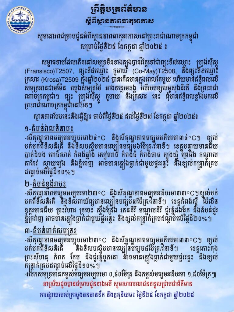 ក្រសួងបញ្ជាក់ថា៖សម្ពាធទាបដែលកើតនៅសមុទ្រចិនខាងត្បូងបានវិវត្តទៅជាព្យុះទី៧ឈ្មោះ ហ្រ្វង់ស៊ីស្កូ (Fransisco)T2507, ព្យុះទី៨ឈ្មោះ កូមាយ (Co-May)T2508, និងព្យុះទី៩ឈ្មោះ ក្រសារ (Krosa)T2509 ក្នុងឆ្នាំ២០២៥ បានកើតមានក្នុងពេលតែមួយ ហើយមានឥទ្ធិពលលើសមុទ្រអានដាមម៉ែន ឈូងសមុទ្រថៃ អាងទន្លេមេគង្គ លើរបបខ្យលមូសុងនិរតី និងព្រះរាជាណាចក្រកម្ពជា។ ព្យុះ ហ្រ្វង់ស៊ីស្កូ កូមាយ និងក្រសារ នេះ ពុំមានឥទ្ធិពលខ្លាំងមកលើព្រះរាជាណាចក្រកម្ពុជានោះទេ។