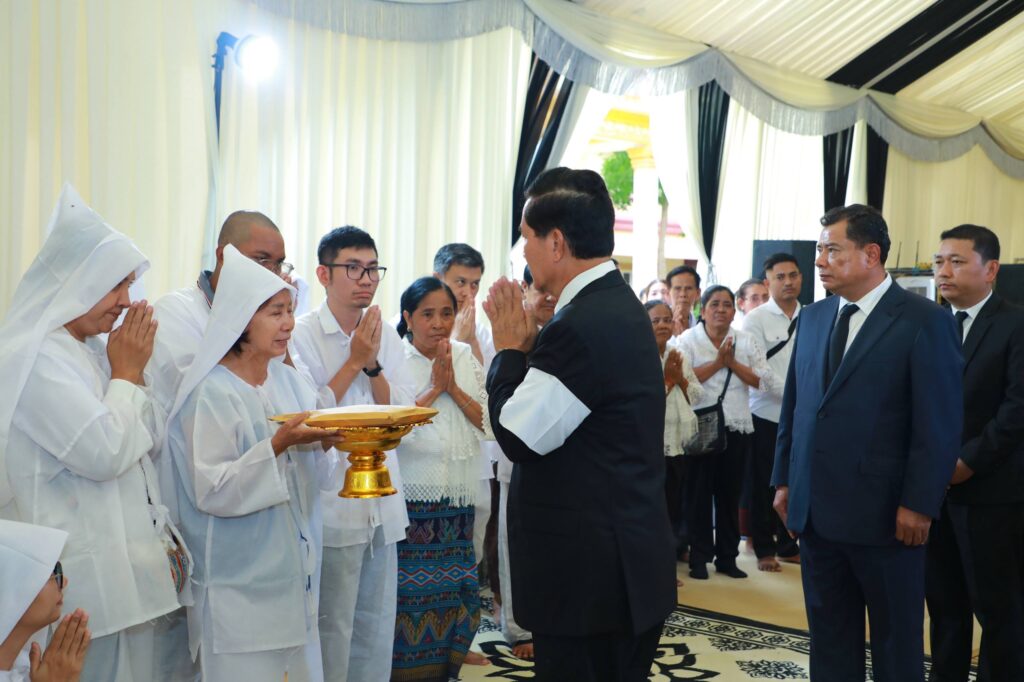 ភ្នំពេញ ៖នារសៀលថ្ងៃទី២៨ ខែកក្កដា ឆ្នាំ២០២៥ គណៈប្រតិភូរដ្ឋបាលរាជធានីភ្នំពេញ ដឹកនាំដោយឯកឧត្ដមឃួង ស្រេង អភិបាលរាជធានីភ្នំពេញបានអញ្ជើញចូលរួមគោរពវិញ្ញាណក្ខន្ធសព ឯកឧត្តម ឧត្តមសេនីយ៍ទោ ដួង សំនៀង មេបញ្ជាការកងពលតូចអន្តរាគមន៍លេខ៧ កងពលធំអន្តរាគមន៍លេខ៣ កងទ័ពជេីងគោកនៃក្រសួងការពារជាតិ ដែលបានពលីជីវិតកាលពីវេលាម៉ោង ១៣:១០ នាទីរសៀលថ្ងៃទី២៦ ខែកក្កដា ឆ្នាំ២០២៥ ក្នុងជន្មាយុ៦៧ឆ្នាំ លើសមរភូមិមុខទិសប្រាសាទតាមាន់ធំ ខេត្តឧត្តរមានជ័យ ជាមួយកងទ័ពថៃ ដេីម្បីបុព្វហេតុការពារដែនអធិបតេយ្យភាព និងបូរណភាពទឹកដីកម្ពុជា៕