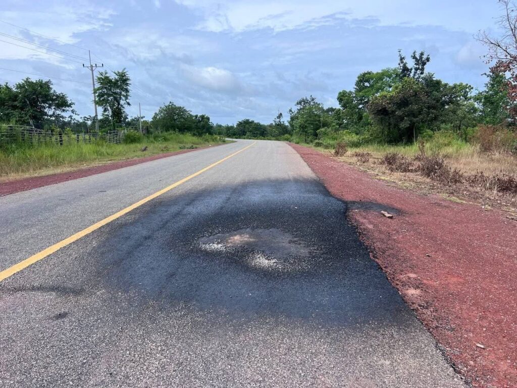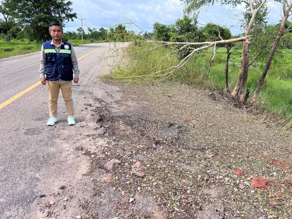 ,PR2PVH5 PK10+030។ខូចខាតដោយគ្រាប់កាំភ្លើងថៃ បង្កការខូចខាតផ្លូវ នៅចំណុចព្រំដែន កម្ពុជា-ថៃ ក្នុងស្រុកជាំក្សាន្ត មន្ត្រីចុះពិនិត្យនិងធ្វើការជួសជុលឡើងវិញ។