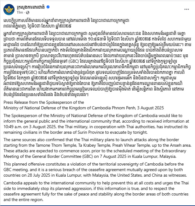 ភ្នំពេញ៖អ្នកនាំពាក្យក្រសួងការពារជាតិ នៃព្រះរាជាណាចក្រកម្ពុជា សូមជូនព័ត៌មានដល់សាធារណៈជន និងសហគមន៍អន្តរជាតិ មេត្តាជ្រាបថា តាមព័ត៌មានដែលទើបទទួលបាន នៅវេលាម៉ោង ១០:៤៩នាទី ថ្ងៃទី០៣ ខែសីហា ឆ្នាំ២០២៥ កងទ័ពថៃ សហការជាមួយអាជ្ញាធរថៃ បានណែនាំឱ្យប្រជាជនខ្លួនដែលនៅសេសសល់នៅតំបន់ជាប់ព្រំដែនក្នុងខេត្តសុរិន្ទ ឱ្យចេញឱ្យអស់ត្រឹមយប់នេះ។