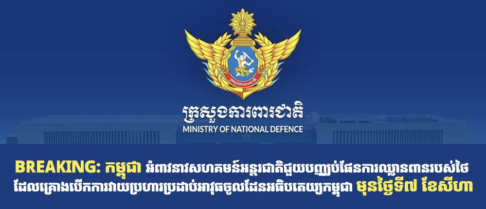 ក្រសួងការពារជាតិកម្ពុជា៖គិតមកដល់វេលាម៉ោង៨:៤០នាទីយប់សភាពការណ៍នៅជួរមុខមានសភាពស្ងប់ស្ងាត់ប៉ុន្តែកងកម្លាំងយើងស្ថិតក្នុងការប្រុងប្រយ័ត្នខ្ពស់
