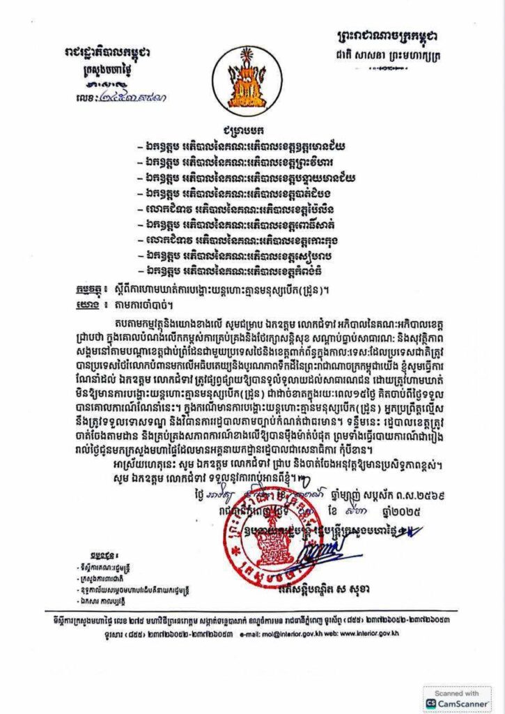 ក្រសួងមហាផ្ទៃ បានចេញសារដល់ខេត្តចំនួន៩ក្នុងនោះ៧ជាប់ព្រំដែនថៃហាមឃាត់ការបង្ហោះដ្រូនរយៈពេល១៥ថ្ងៃ
