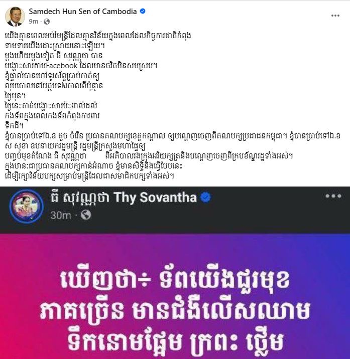 សំណេររបស់សម្តេចតេជោ ហ៊ុន សែន បង្ហោះក្នុងបណ្តាញទំនាក់ទំនងសង្គមផ្លូវការមានខ្លឹមសារទាំងស្រុងដូច្នេះ៖ យើងគ្មានពេលអប់រំមន្ត្រី ដែលគ្មានវិន័យក្នុងពេល ដែលកិច្ចការជាតិកំពុងទាមទារយើងដោះស្រាយនោះឡើយ។ ម្តងហើយម្តងទៀត ធី សុវណ្ណថា បានបង្ហោះសារតាម Facebook ដែលមានចរិតមិនសមស្រប។ ខ្ញុំផ្ទាល់បានហៅទូរស័ព្ទប្រាប់គាត់ឲ្យលុបចោល នៅអត្ថបទ២កាលពីប៉ុន្មានថ្ងៃមុន ថ្ងៃនេះគាត់បង្ហោះសារប៉ះពាល់ ដល់កងទ័ពក្នុងពេលកងទ័ពកំពុងការពារទឹកដី។