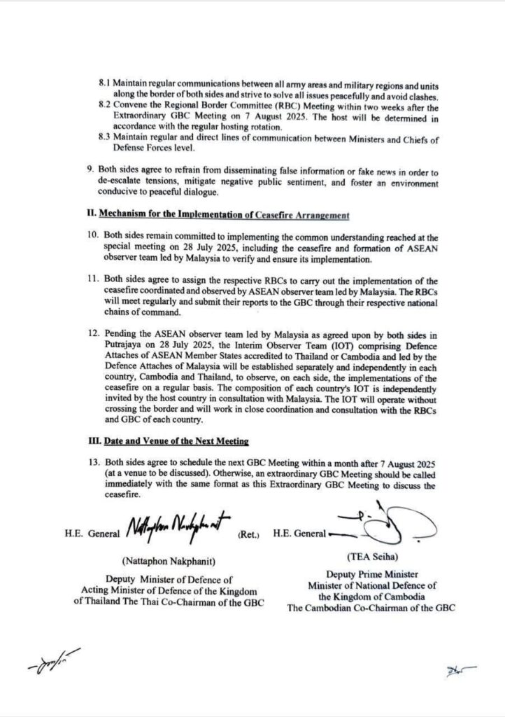១៣. ភាគីទាំងសងខាងបានឯកភាពកំណត់ពេលវេលារៀបចំកិច្ចប្រជុំ GBC ក្នុងរយៈពេល១ខែ បន្ទាប់ពីថ្ងៃទី៧ ខែកក្កដា ឆ្នាំ២០២៥ (ទីតាំងរៀបចំកិច្ចប្រជុំនឹង ត្រូវបានពិភាក្សាតាមក្រោយ។ បើពុំដូច្នោះទេ កិច្ចប្រជុំពិសេស GBC នឹងត្រូវរៀបចំឡើងភ្លាមៗ ដោយប្រើទម្រង់នៃកិច្ចប្រជុំដដែល ដើម្បីពិភាក្សាអំពីកិច្ចព្រមព្រៀងឈប់បាញ់៕