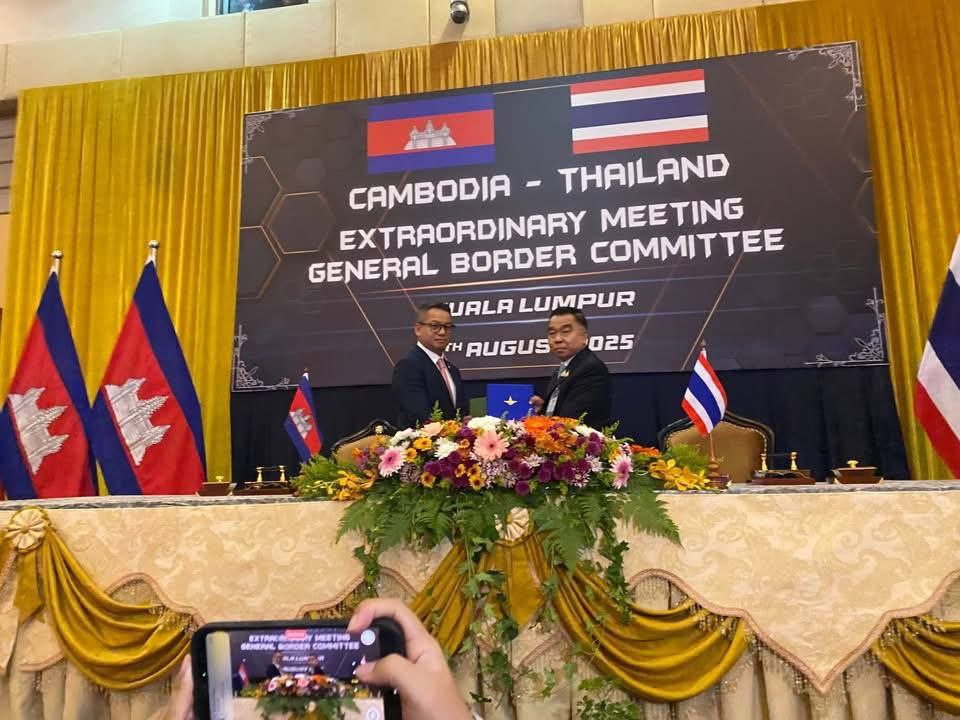 ម៉ាឡេស៊ី៖ឧបនាយករដ្ឋមន្រ្តី ទៀ សីហា រដ្ឋមន្រ្តីក្រសួងការពារជាតិកម្ពុជា បានធ្វើសន្និសីទសារព័ត៌មាន «ស្តីពីលទ្ធផលកិច្ចប្រជុំវិសាមញ្ញ គណៈកម្មាធិការព្រំដែនទូទៅកម្ពុជា-ថៃ (GBC) នៅប្រទេសម៉ាឡេស៊ី» នារសៀលថ្ងៃទី០៧ ខែសីហា ឆ្នាំ២០២៥ ដោយបង្ហាញលទ្ធផលព្រមព្រៀង១៣ចំណុចដូចខាងក្រោម (បកប្រែក្រៅផ្លូវការ)៖