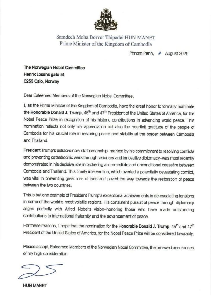 សម្តេចធិបតីហ៊ុនម៉ាណែតផ្ញើលិខិតជាផ្លូវការទៅគណៈកម្មការពានរង្វាន់ណូបែលសន្តិភាពដើម្បីគាំទ្របេក្ខភាពប្រធានាធិបតី Donald Trump សម្រាប់ពានរង្វាន់ណូបែលសន្តិភាព
