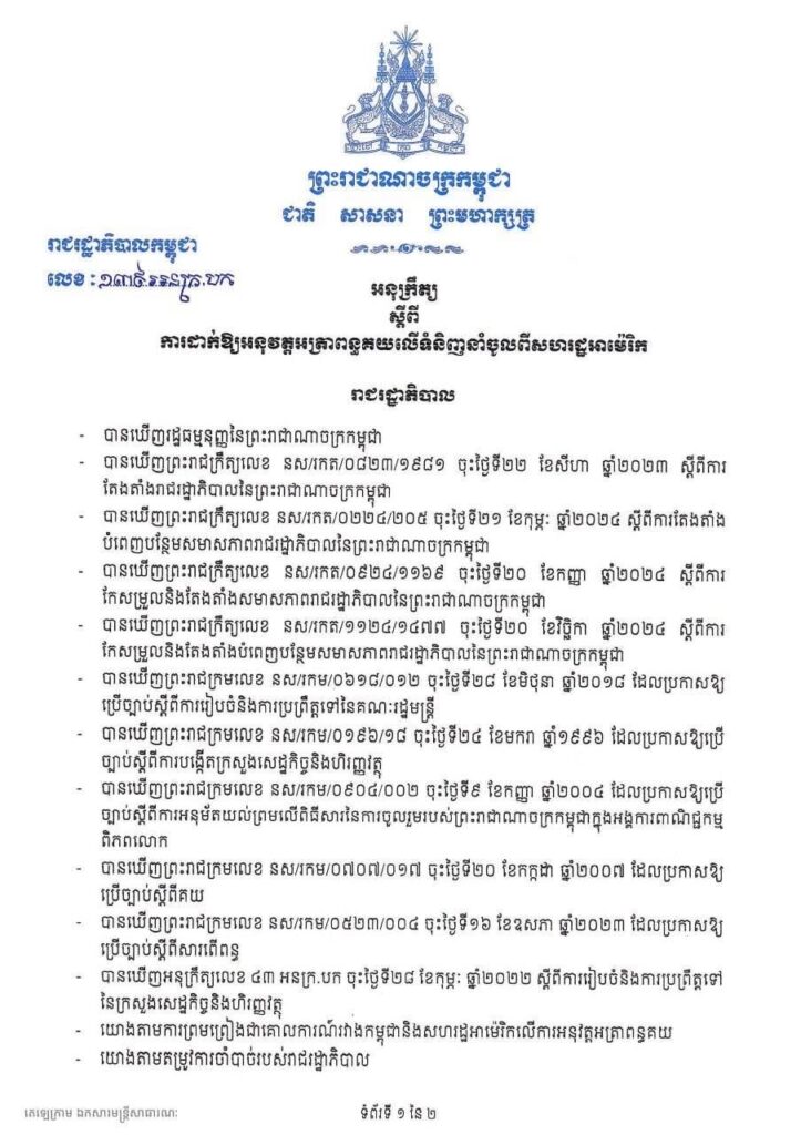 ប្រមុខរាជរដ្ឋាភិបាលកម្ពុជាចេញអនុក្រឹត្យស្ដីពីការអនុវត្តអត្រាពន្ធគយ០% លើទំនិញរបស់សហរដ្ឋអាម៉េរិក