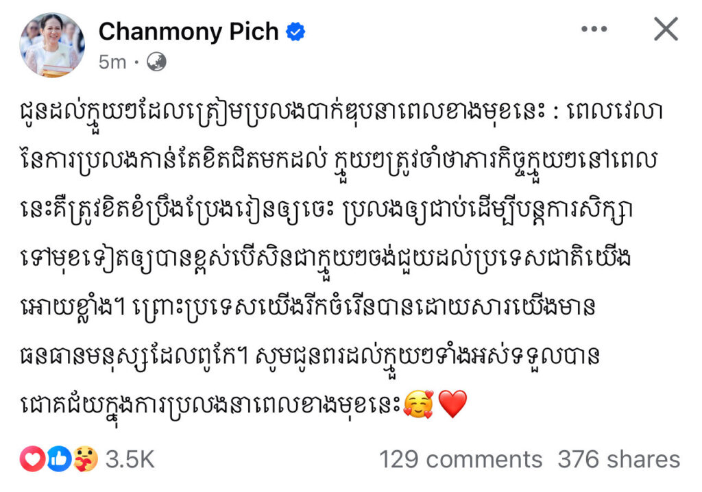 លោកជំទាវបណ្ឌិតពេជចន្ទមុន្នីហ៊ុនម៉ាណែតផ្ញើសារទៅកាន់សិស្សត្រៀមប្រឡងបាក់ឌុប៖ «បើសិនជាក្មួយៗចង់ជួយដល់ប្រទេសជាតិយេីងឱ្យខ្លាំងត្រូវខំប្រឹងរៀនឲ្យចេះប្រឡងឲ្យជាប់បន្តការសិក្សាឲ្យបានខ្ពស់»