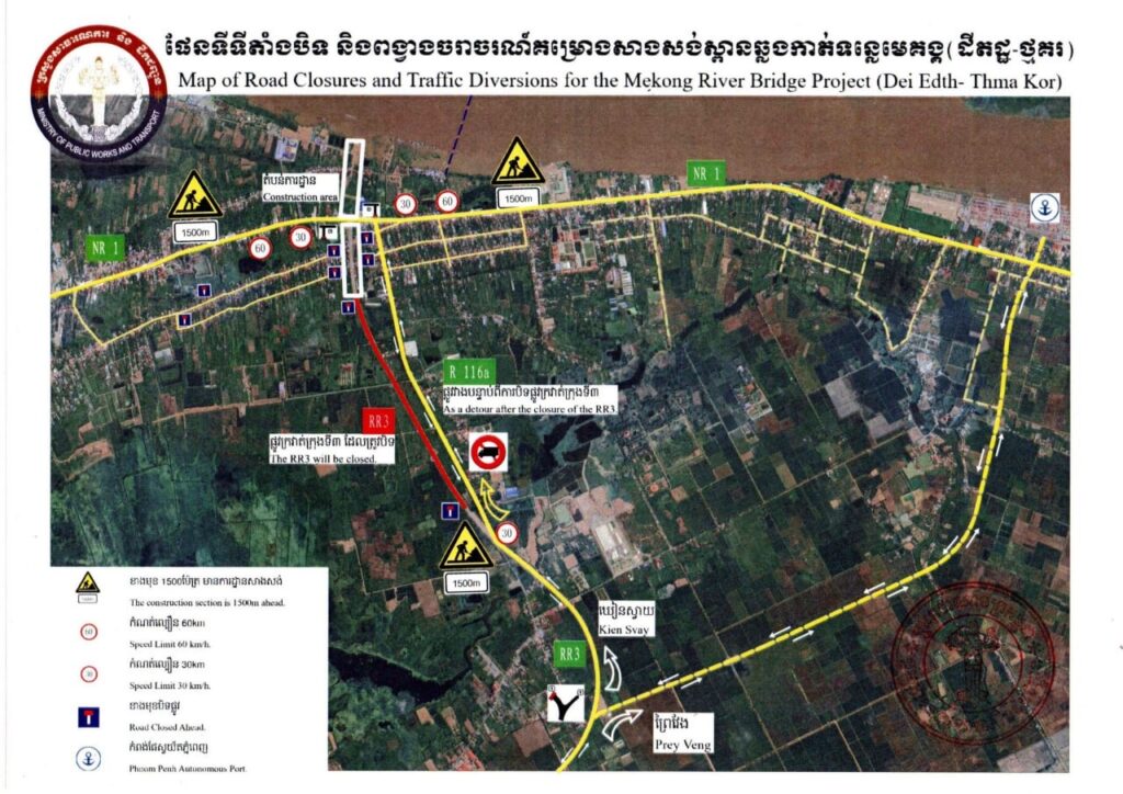 ភ្នំពេញ៖ក្រសួងសាធារណការ និងដឹកជញ្ជូន ប្រកាសការបិទចរាចរណ៍យានយន្តគ្រប់ប្រភេទជាបណ្តោះអាសន្នលើមហាវិថី ស៊ី ជីនពីង (ផ្លូវក្រវាត់ក្រុងទី៣) ចាប់ពី គ.ម ២+៨០០ ដល់ផ្លូវជាតិលេខ១ ចាប់ពីថ្ងៃទី១ ខែកញ្ញា ឆ្នាំ២០២៥ វេលាម៉ោង០៧ព្រឹក តទៅរហូតដល់ ថ្ងៃទី១ ខែកុម្ភៈ ឆ្នាំ២០២៨ ដើម្បីអនុវត្តគម្រោងសាងសង់ស្ពានឆ្លងកាត់ទន្លេមេគង្គ (ដីឥដ្ឋ-ថ្មគរ) ដែលមានទីតាំងផ្នែកខាងលិច នៅឃុំដីឥដ្ឋ ស្រុកកៀនស្វាយ និងខាងកើតស្ថិតនៅឃុំថ្មគរ ស្រុកល្វាឯម ខេត្តកណ្តាល។