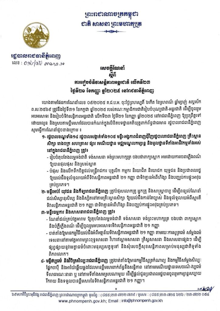 ភ្នំពេញ៖យោងតាមផែនការណែនាំលេខ ០៩/២០២៥ គ.ជ.ប.អ. ចុះថ្ងៃព្រហស្បតិ៍ ៦កើត ខែស្រាពណ៍ ឆ្នាំម្សាញ់ សប្តស័ក ព.ស.២៥៦៩ ត្រូវនឹងថ្ងៃទី៣១ ខែកក្កដា ឆ្នាំ២០២៥ របស់គណៈកម្មាធិការជាតិរៀបចំបុណ្យជាតិ-អន្តរជាតិ ដើម្បីចូលរួម អបអរសាទរ និងរៀបចំទិវាសន្តិភាពអន្តរជាតិ លើកទី២៣ ថ្ងៃទី២១ ខែកញ្ញា ឆ្នាំ២០២៥ នៅរាជធានីភ្នំពេញ ឱ្យប្រព្រឹត្តទៅ ដោយរលូន និងស្របតាមខ្លឹមសារដែលបានកំណត់ក្នុងលិខិតបទដ្ឋានគតិយុត្តពាក់ព័ន្ធជាធរមាន រដ្ឋបាលរាជធានីភ្នំពេញ សូមធ្វើការណែនាំដូចខាងក្រោម ៖