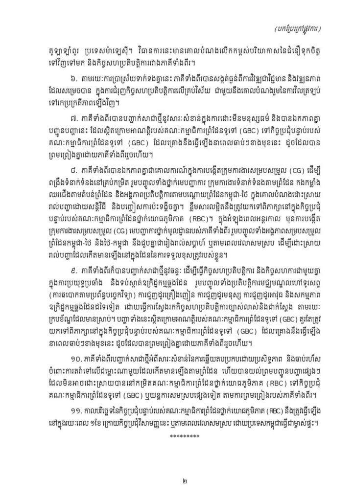 ១០. ភាគីទាំងពីរបញ្ជាក់សាជាថ្មីអំពីសារៈសំខាន់នៃការឆ្លើយតបប្រកបដោយប្រសិទ្ធភាព និងឆាប់រហ័ស ចំពោះការតវ៉ាទៅលើជម្លោះណាមួយដែលកើតមានឡើងតាមព្រំដែន ហើយបានយល់ព្រមបញ្ជូនបញ្ហាផ្សេងៗ ដែលមិនអាចដោះស្រាយបាននៅកម្រិតគណៈកម្មាធិការព្រំដែនថ្នាក់យោធភូមិភាគ (RBC) ទៅកិច្ចប្រជុំ គណៈកម្មាធិការព្រំដែនទូទៅ (GBC) ឬយន្តការសមស្របផ្សេងទៀត តាមការព្រមព្រៀងរបស់ភាគីទាំងពីរ។