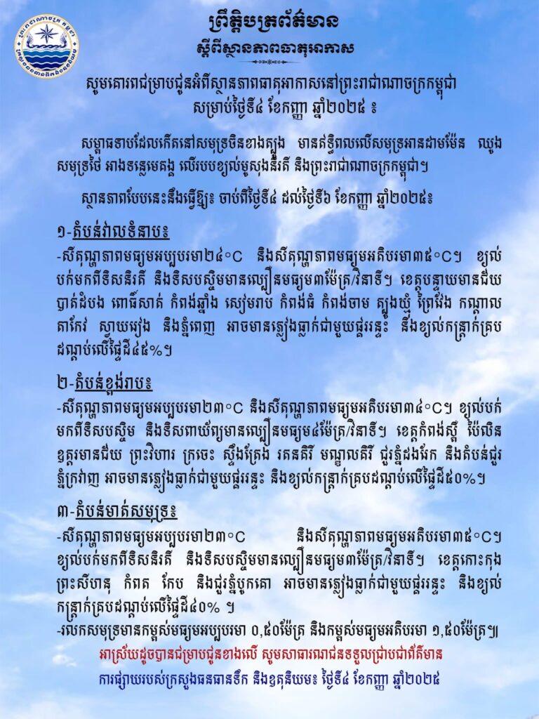 ក្រសួងធនធានទឹកជូនដំណឹងអំពីស្ថានភាពធាតុអាកាសនៅព្រះរាជាណាចក្រកម្ពុជា សម្រាប់ថ្ងៃទី៤ ខែកញ្ញា ឆ្នាំ២០២៥