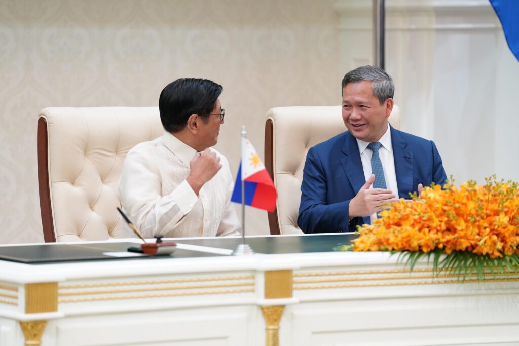 ភ្នំពេញ៖កាលពីព្រឹកថ្ងៃទី៨ ខែកញ្ញា ឆ្នាំ២០២៥នៅវិមានសន្តិភាពសម្តេចមហាបវរធិបតី ហ៊ុន ម៉ាណែត នាយករដ្ឋមន្រ្តី នៃព្រះរាជាណាចក្រកម្ពុជា បានជួបពិភាក្សាការងារទ្វេភាគី ជាមួយឯកឧត្តម ហ្វឺឌីណាន់ រ៉ូម៉ូលដេស ម៉ាកូស ជូញៀ (Ferdinand Romualdez Marcos Jr.) ប្រធានាធិបតី នៃសាធារណរដ្ឋហ្វីលីពីន និងគណៈប្រតិភូជាន់ខ្ពស់ ក្នុងដំណើរទស្សនកិច្ចផ្លូវរដ្ឋ នៅព្រះរាជាណាចក្រកម្ពុជា ពីថ្ងៃទី៧ ដល់ថ្ងៃទី៩ ខែកញ្ញា ឆ្នាំ២០២៥ ។