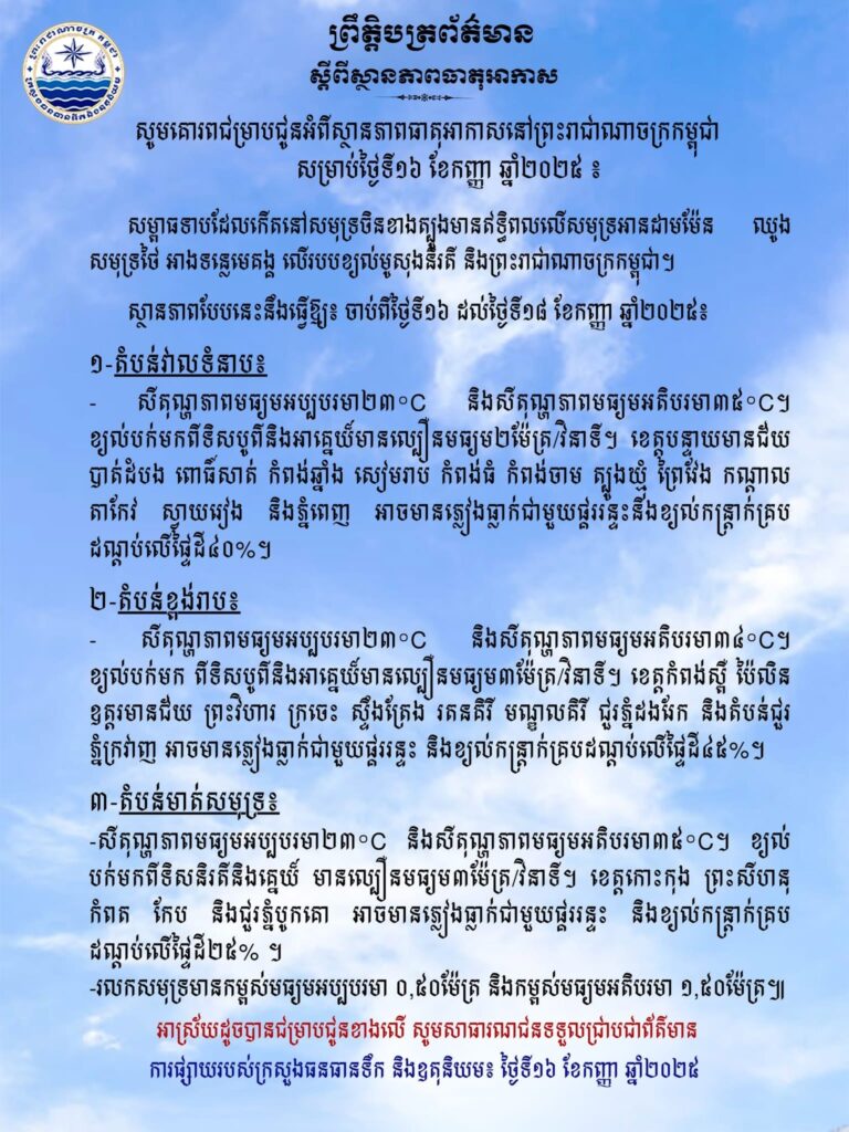ភ្នំពេញ៖ក្រសួងធនធានទឹក និងឧតុនិយម បានចេញសេចក្តីជូនដំណឹង អំពីស្ថានភាពធាតុអាកាសនៅកម្ពុជា សម្រាប់ថ្ងៃទី១៦ ខែកញ្ញា ឆ្នាំ២០២៥។