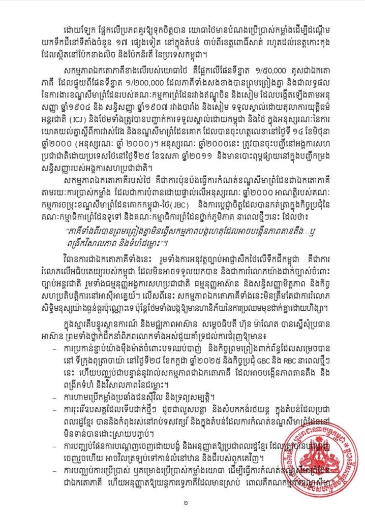 សម្តេចមហាបវរធិបតី ហ៊ុន ម៉ាណែត នាយករដ្ឋមន្ត្រីនៃកម្ពុជា បានផ្ញើសារលិខិតជូន ឯកឧត្តម អាន់វ៉ា អ៊ីប្រាហ៊ីម នាយករដ្ឋមន្ត្រីម៉ាឡេស៊ី និងជាប្រធានអាស៊ានបច្ចុប្បន្ន ព្រមទាំងថ្នាក់ដឹកនាំពិភពលោក នានាដែលរួមមាន ឯកឧត្តមស៊ី ជើងពឹង ប្រធានាធិបតីចិន ឯកឧត្តម ដូណាល់ ត្រាំ ប្រធានាធិបតី សហរដ្ឋអាមេរិក និងឯកឧត្តម អេម៉ាណូអែល ម៉ាក្រុង ប្រធានាធិបតីបារាំង ឯកឧត្តមអង់តូនីញូ ហ្គោ តេរ៉េស អគ្គលេខាធិការ អង្គការសហប្រជាជាតិ និង លោកជំទាវ អាណាលេណា បេណាបក ប្រធានមហា សន្និបាតអង្គការសប្រជាជាតិលើកទី៨០។ គោលបំណងនៃលិខិត គឺដើម្បីទាញចំណាប់អារម្មណ៍របស់ ថ្នាក់ដឹកនាំពិភពលោកទាំងអស់ ទៅលើស្ថានការណ៍ថ្មីៗនៅតាមព្រំដែនកម្ពុជា-ថៃ ដែលបង្កការគំរាម កំហែងដល់សន្តិភាព និងស្ថិរភាព មិនត្រឹមតែសម្រាប់ប្រជាជាតិទាំងពីរប៉ុណ្ណោះទេ គឺថែមទាំងសម្រាប់ តំបន់យើងទាំងមូលផងដែរ។