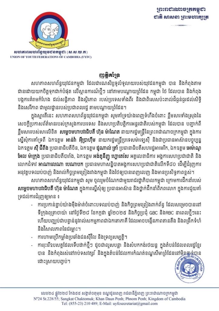 ក្នុងស្មារតីនេះ សហភាពសហព័ន្ធយុវជនកម្ពុជា សូមគាំទ្រយ៉ាងពេញទំហឹងចំពោះ ខ្លឹមសារទាំងស្រុងនៃសេចក្តីប្រកាសព័ត៌មានរបស់ក្រសួងការបរទេស និងសហប្រតិបត្តិការអន្តរជាតិរបស់កម្ពុជា ដែលបានបញ្ជាក់ពីខ្លឹមសាររបស់សារលិខិត សម្តេចមហាបវរធិបតី ហ៊ុន ម៉ាណែត នាយករដ្ឋមន្ត្រីនៃកម្ពុជា ក្នុងការស្នើសុំការគាំទ្រពី ឯកឧត្ដម អាន់វ៉ា អ៊ីប្រាហ៊ីម នាយករដ្ឋមន្ត្រីប្រទេសម៉ាឡេស៊ី និងជាប្រធានអាស៊ានបច្ចុប្បន្ន ឯកឧត្ដម ស៊ី ជីពឹង ប្រធានាធិបតីចិន, ឯកឧត្តម ដូណាល់ ត្រាំ ប្រធានាធិបតីសហរដ្ឋអាមេរិក, ឯកឧត្តម អេម៉ាណូ អែល ម៉ាក្រុង ប្រធានាធិបតីបារាំង, ឯកឧត្តម អង់តូនីញូ ហ្គោតេរ៉ស អគ្គលេខាធិការ អង្គការសហប្រជាជាតិ និង លោកជំទាវ អាណាលេណា បេណាបក ប្រធានមហាសន្និបាតអង្គការសហប្រជាជាតិលើកទី៨០ ដើម្បីជំរុញការ អនុវត្តបទឈប់បាញ់ និងរាល់កិច្ចព្រមព្រៀងរវាងកម្ពុជា និងថៃឲ្យបានពេញលេញ និងមានប្រសិទ្ធភាពខ្ពស់៕