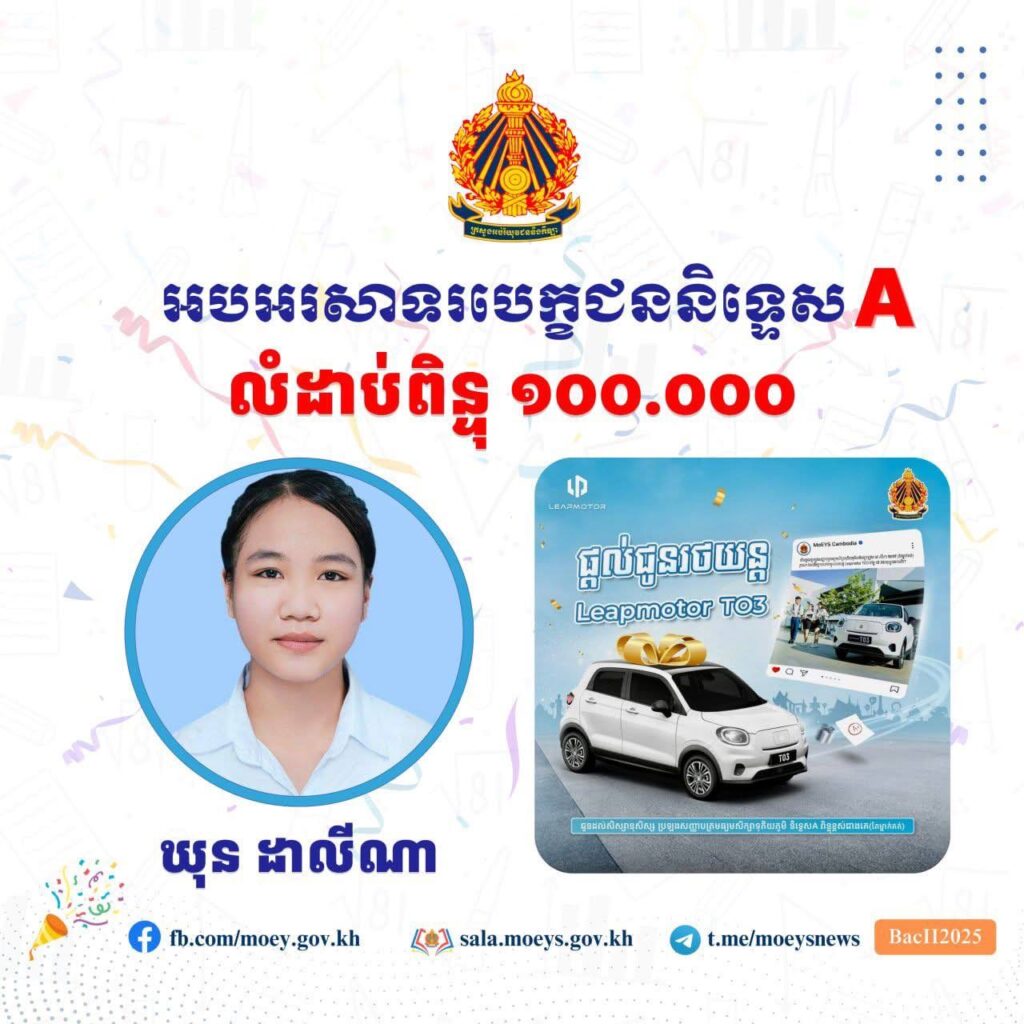 ភ្នំពេញ៖ក្រសួងអប់រំ យុវជន និងកីឡា បានបញ្ជាក់ឱ្យដឹងនៅព្រឹកថ្ងៃទី២០ ខែកញ្ញា ឆ្នាំ២០២៥នេះថា បេក្ខជនប្រឡងសញ្ញាបត្រមធ្យមសិក្សាទុតិយភូមិ ដែលបាន និទ្ទេស A លំដាប់ ពិន្ទុ ១០០.០០០ សម្រាប់ឆ្នាំ២០២៥នេះ បានទៅលើយុវតី ឃុន ដាលីណា ជា បេក្ខជន នៅ ខេត្តបន្ទាយមានជ័យ និងជាអ្នកទទួលបានរថយន្តអគ្គិសនី Leapmotor TO3 ។