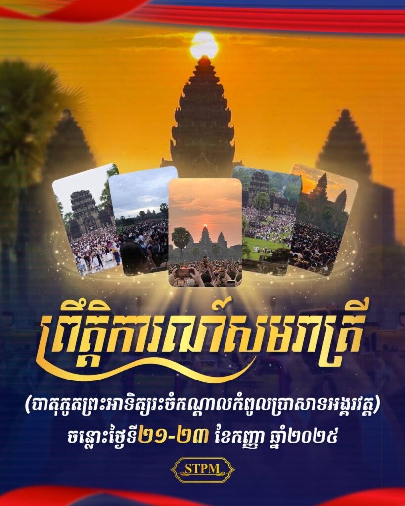 អបអរសាទរ ព្រឹត្តិការណ៍ព្រះអាទិត្យរះចំកណ្ដាលកំពូលប្រាសាទអង្គរវត្ត ចេញផ្សាយ ថ្ងៃទី 21 ខែ September ឆ្នាំ 2025 118 ចែករំលែក ភ្នំពេញ៖អបអរសាទរ ព្រឹត្តិការណ៍សមរាត្រី (បាតុភូតព្រះអាទិត្យរះចំកណ្ដាលកំពូលប្រាសាទអង្គរវត្ត)រដូវវស្សា Autumnal Equinox ចន្លោះថ្ងៃទី ២១ ដល់ ២៣ កញ្ញា ២០២៥៕