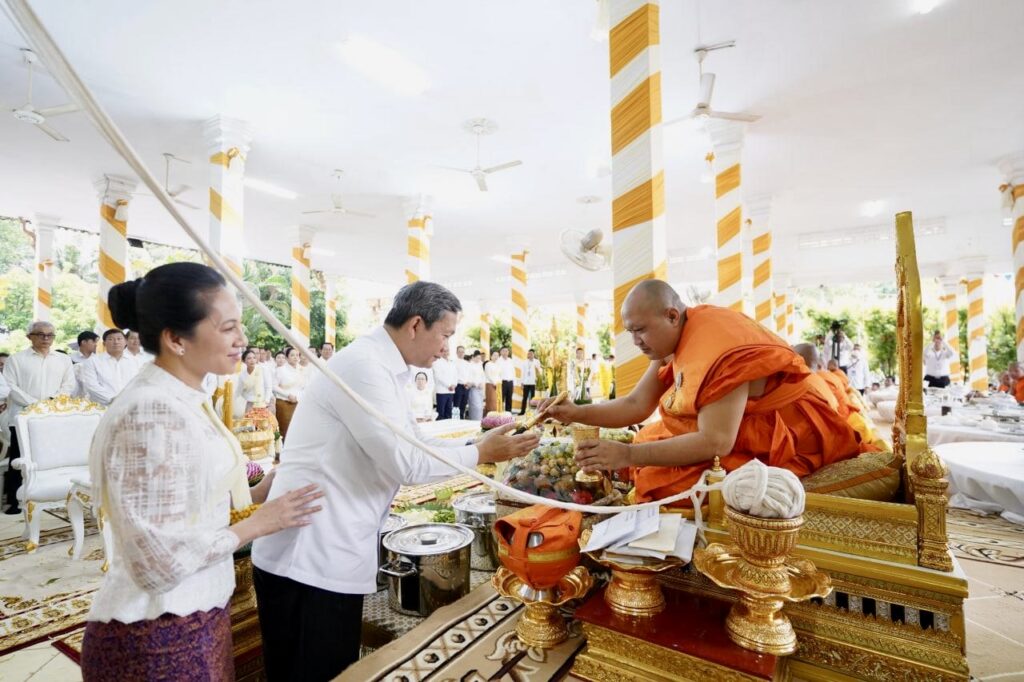 សម្តេចមហាបវរធិបតី និងលោកជំទាវបណ្ឌិត ព្រមទាំងឥស្សរ ជន ជាន់ខ្ពស់ទាំងអស់ និងពុទ្ធបរិស័ទទីជិតឆ្ងាយ បានធ្វើ បទ នមសិកាព្រះរតនត្រ័យ សមាទានសិល៍ រំលឹកដល់ព្រះសម្មា សម្ពុទ្ធព្រះបរមគ្រួនៃយើង ដែល ព្រះ អង្គត្រាសដឹង នូវអនុត្តរះសម្មាសម្ពុទ្ធធិញាណ និងព្រះធម៌វិន័យដ៏វិសេសវិសាល បន្សល់ទុកឲ្យ ពុទ្ធ បរិ ស័ទ គ្រប់ជំនាន់ គោរពប្រតិបត្តិជារៀងដរាប រហូត មកដល់បច្ចុប្បន្ន និងទៅអនាគត។