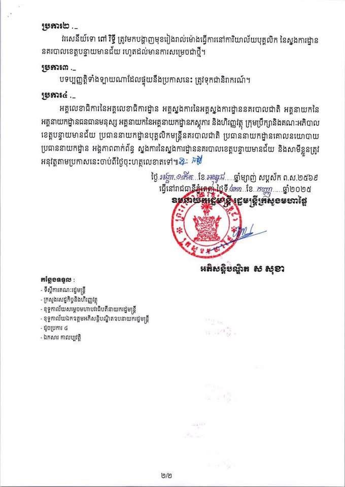 ភ្នំពេញ៖លោកអភិសន្តិបណ្ឌិត ស សុខា ឧបនាយករដ្ឋមន្ត្រី រដ្ឋមន្ត្រីក្រសួងមហាផ្ទៃ នាថ្ងៃទី២៣ ខែកញ្ញា ឆ្នាំ២០២៥នេះ បានសម្រេចផ្អាកការងារជាបណ្តោះអាសន្នចំពោះ លោកវរសេនីយ៍ទោ ពៅ រិទ្ធី មេបញ្ជាការរង នៃវរសេនាតូចនគរបាលការពារព្រំដែនគោកលេខ៨៩១ ស្នងការដ្ឋាននគរបាលខេត្តបន្ទាយមានជ័យ ដើម្បីបើកផ្លូវឲ្យតុលាការបន្តនីតិវិធីតាមផ្លូវច្បាប់។