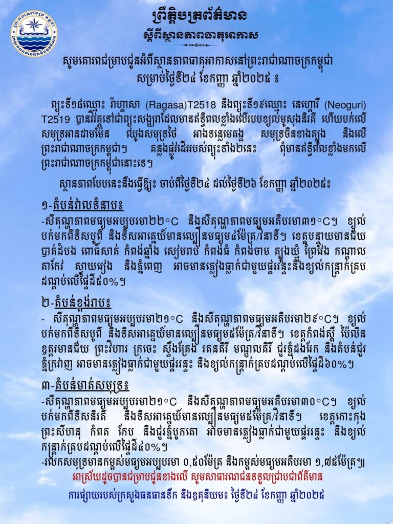 ភ្នំពេញ៖ក្រសួងធនធានទឹក និងឧតុនិយម បានចេញសេចក្តីជូនដំណឹង អំពីស្ថានភាពធាតុអាកាសនៅកម្ពុជា សម្រាប់ថ្ងៃទី២៤ ខែកញ្ញា ឆ្នាំ២០២៥។