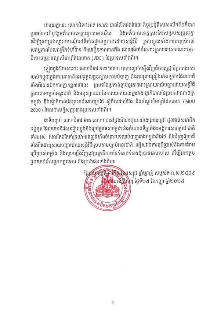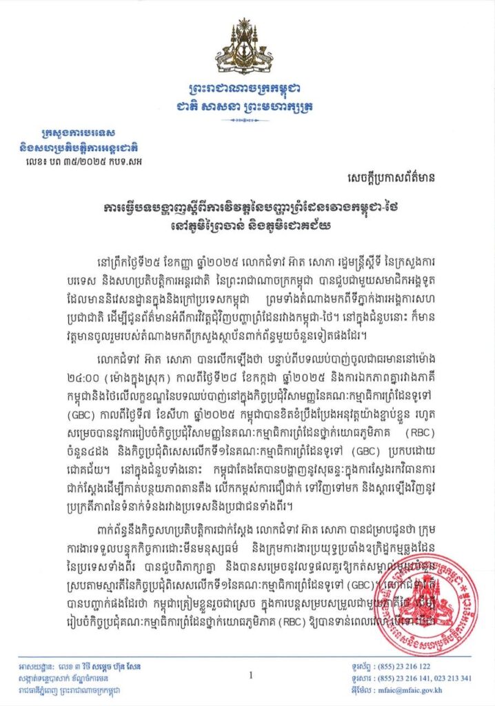 នៅក្នុងចេញសេចក្តីប្រកាសរបស់ក្រសួងការបរទសកម្ពុជា មានខ្លឹមសារដូចនេះទៀតថា លោកជំទាវ អ៊ាត សោភា បានលើកឡើងថា បន្ទាប់ពីបទឈប់បាញ់ចូលជាធរមាននៅម៉ោង២៤:០០ (ម៉ោងក្នុងស្រុក) កាលពីថ្ងៃទី២៨ ខែកក្កដា ឆ្នាំ២០២៥ និងការឯកភាពគ្នារវាងភាគី កម្ពុជា និងថៃលើលក្ខខណ្ឌនៃបទឈប់បាញ់នៅក្នុងកិច្ចប្រជុំវិសាមញ្ញនៃគណៈកម្មាធិការព្រំដែនទូទៅ (GBC) កាលពីថ្ងៃទី៧ ខែសីហា ឆ្នាំ២០២៥ កម្ពុជាបានខិតខំប្រឹងប្រែងអនុវត្តយ៉ាងខ្ជាប់ខ្ជួន រហូតសម្រេចបាននូវការរៀបចំកិច្ចប្រជុំវិសាមញ្ញនៃគណៈកម្មាធិការព្រំដែនថ្នាក់យោធភូមិភាគ (RBC) ចំនួន៤ដង និងកិច្ចប្រជុំពិសេសលើកទី១នៃគណៈកម្មាធិការព្រំដែនទូទៅ (GBC) ប្រកបដោយជោគជ័យ។ នៅក្នុងជំនួបទាំងនោះ កម្ពុជាតែងតែបានបង្ហាញនូវសុឆន្ទៈក្នុងការស្វែងរកវិធានការ ជាក់ស្ដែងដើម្បីកាត់បន្ថយភាពតានតឹង លើកកម្ពស់ការជឿជាក់ ទៅវិញទៅមក និងស្តារឡើងវិញនូវប្រក្រតីភាពនៃទំនាក់ទំនងរវាងប្រទេសនិងប្រជាជនទាំងពីរ។