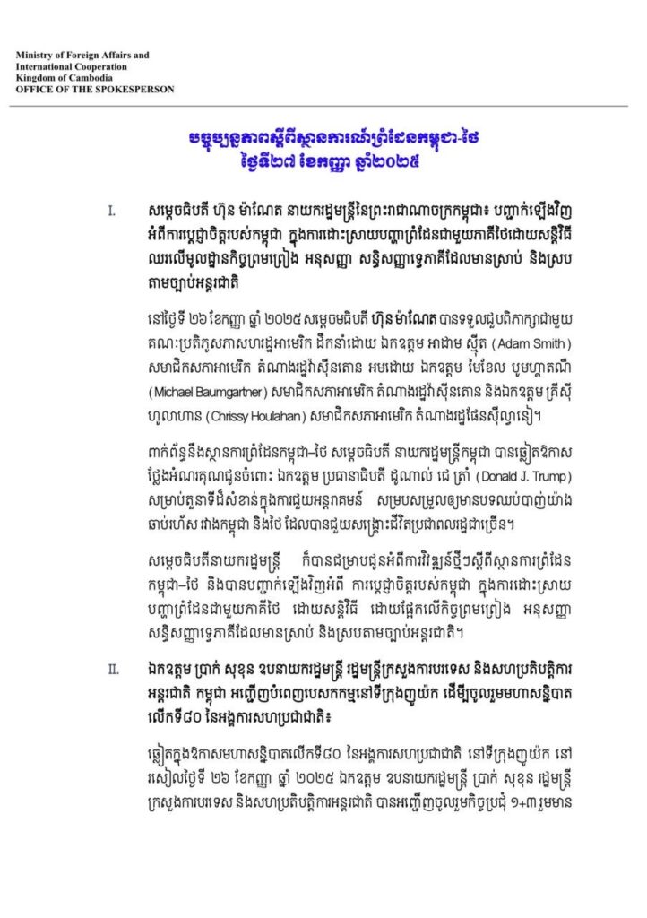 ភ្នំពេញ៖ថ្ងៃទី២៧ ខែកញ្ញា ឆ្នាំ២០២៥ ក្រសួងការបរទេសកម្ពុជា ចេញសេចក្តីប្រកាសព័ត៌មាន៖ បច្ចុប្បន្នភាពស្ដីពីស្ថានការណ៍ព្រំដែនកម្ពុជា-ថៃ ថ្ងៃទី ២៧ ខែកញ្ញា ឆ្នាំ២០២៥  ។