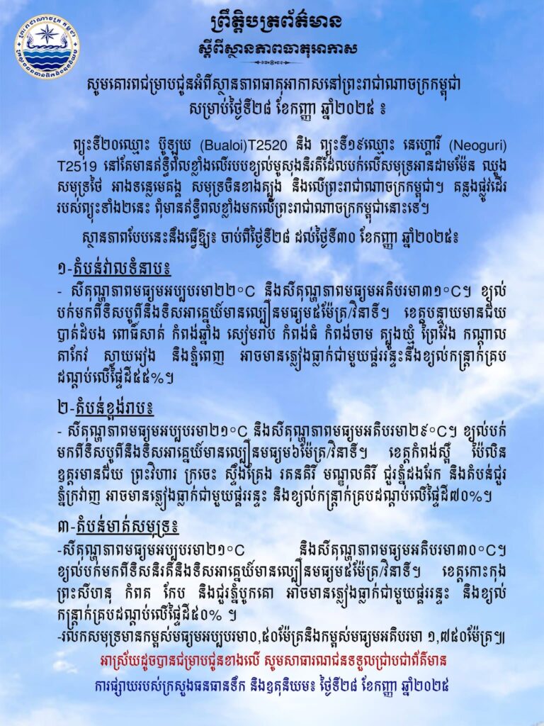 ក្រសួងធនធានទឹក ជូនដំណឹងអំពីស្ថានភាពធាតុអាកាសនៅកម្ពុជា សម្រាប់ថ្ងៃទី២៨ ខែកញ្ញា ឆ្នាំ២០២៥