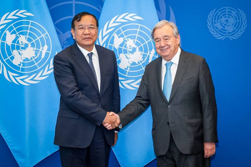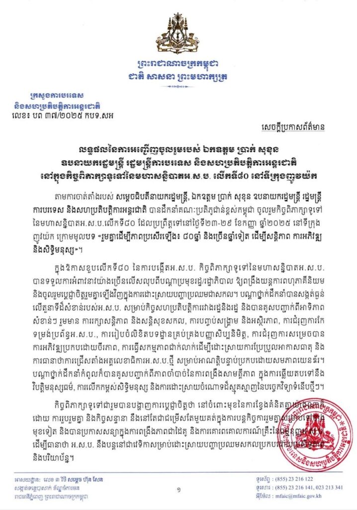 សេចក្ដីប្រកាសព័ត៌មានរបស់ក្រសួងការបរទេស និងសហប្រតិបត្តិការអន្ដរជាតិ  ទទួលបាននៅព្រឹកថ្ងៃទី៣០ ខែកញ្ញា ឆ្នាំ២០២៥នេះ បានបញ្ជាក់ថា ក្នុងមហាសន្និបាតអង្គការសហប្រជាជាតិ ឧបនាយករដ្ឋមន្ដ្រី ប្រាក់ សុខុន បានបង្ហាញនូវនូវក្តីបារម្ភយ៉ាងជ្រាលជ្រៅចំពោះភាពតានតឹងដែលកំពុងបន្តនៅតាមព្រំដែនជាមួយប្រទេសថៃ ដោយបានប្រកាសប្រឆាំងនឹងការរំលោភអធិបតេយ្យ និងអំពាវនាវឲ្យគោរពយ៉ាង ម៉ឺងម៉ាត់លើបទឈប់បាញ់ កិច្ចសន្ទនា និងដំណោះស្រាយដោយសន្តិវិធី ស្របតាមច្បាប់អន្តរជាតិ។ កម្ពុជាបានអំពាវនាវឲ្យមានការគាំទ្រពីអាស៊ាន អង្គការសហប្រជាជាតិ និងសហគមន៍អន្តរជាតិ ឲ្យជួយបន្ធូរបន្ថយភាព តានតឹង និងស្តារឡើងវិញនូវជំនឿទុកចិត្តរវាងប្រទេសទាំងពីរ។