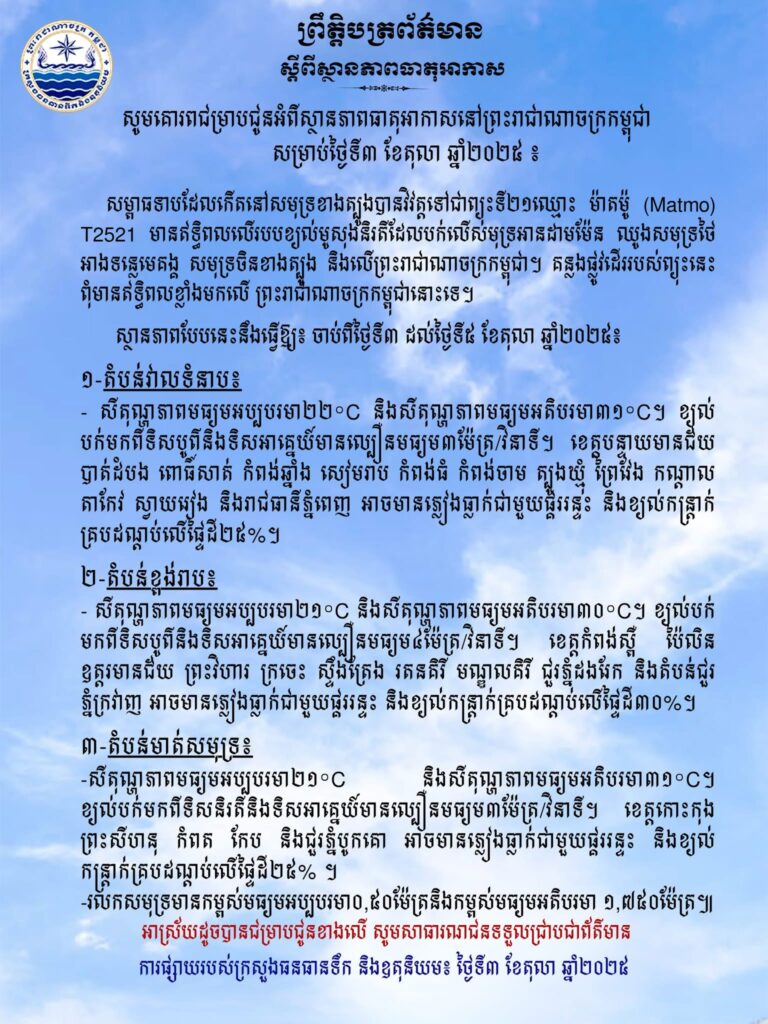 ក្រសួងបញ្ជាក់ថា៖សម្ពាធទាបដែលកើតនៅសមុទ្រខាងត្បូងបានវិវត្តទៅជាព្យុះទី២១ឈ្មោះ ម៉ាតម៉ូ(Matmo) T2521 មានឥទ្ធិពលលើរបបខ្យល់មូសុងនិរតីដែលបក់លើសមុទ្រអានដាមម៉ែន ឈូងសមុទ្រថៃ អាងទន្លេមេគង្គ សមុទ្រចិនខាងត្បូង និងលើព្រះរាជាណាចក្រកម្ពុជា។ គន្លងផ្លូវដើររបស់ព្យុះនេះពុំមានឥទ្ធិពលខ្លាំងមកលើ ព្រះរាជាណាចក្រកម្ពុជានោះទេ។