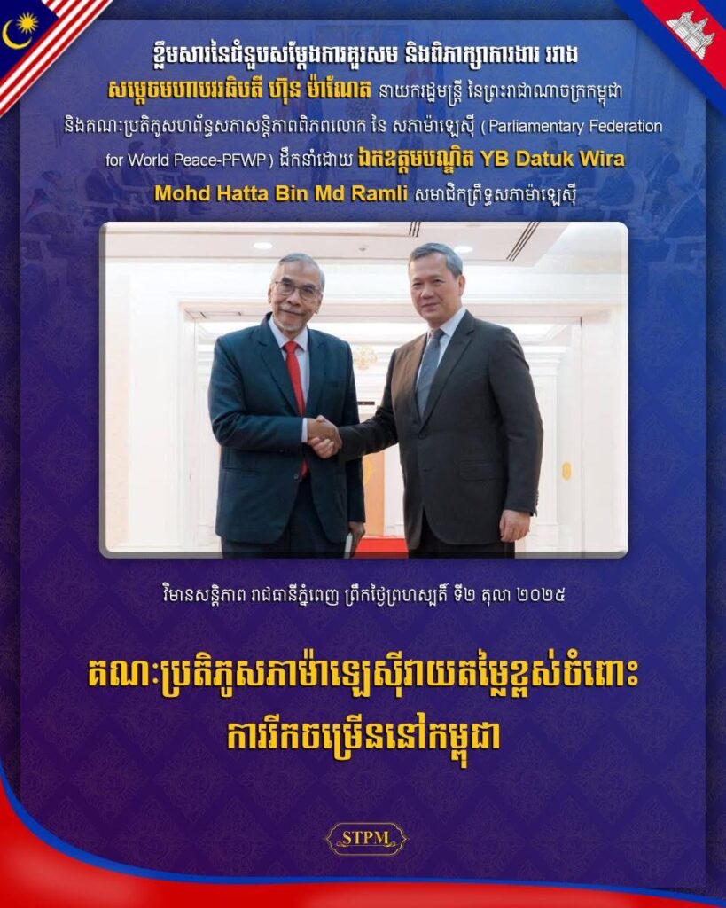 ភ្នំពេញ៖នាព្រឹក ថ្ងៃទី០២ ខែតុលា ឆ្នាំ២០២៥ នៅវិមានសន្តិភាព សម្តេចមហាបវរធិបតី ហ៊ុន ម៉ាណែត នាយករដ្ឋមន្ត្រី នៃព្រះរាជាណាចក្រកម្ពុជា បានអនុញ្ញាតឱ្យគណៈប្រតិភូសហព័ន្ធសភាសន្ដិភាពពិភពលោកនៃសភាម៉ាឡេស៊ី (PFWP) ដឹកនាំដោយឯកឧត្តមបណ្ឌិត Mohd Hatta សមាជិកព្រឹទ្ធសភាម៉ាឡេស៊ី ចូលជួបសម្តែងការគួរសម និងពិភាក្សាការងារ។