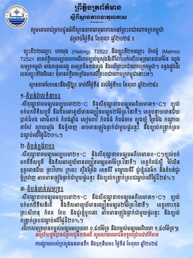 ក្រសួងបញ្ជាក់ថា៖ព្យុះទី២២ឈ្មោះ ហាលុង (Halong) T2522 និងព្យុះទី២១ឈ្មោះ ម៉ាតម៉ូ (Matmo) T2521 មានឥទ្ធិពលខ្សោយមកលើរបបខ្យល់មូសុងនិរតីដែលបក់លើសមុទ្រអានដាមម៉ែន ឈូងសមុទ្រកម្ពុជា អាងទន្លេមេគង្គ សមុទ្រចិនខាងត្បូង និងលើព្រះរាជាណាចក្រកម្ពុជា។ គន្លងផ្លូវដើររបស់ព្យុះទាំងពីរនេះ ពុំមានឥទ្ធិពលខ្លាំងមកលើព្រះរាជាណាចក្រកម្ពុជានោះទេ។