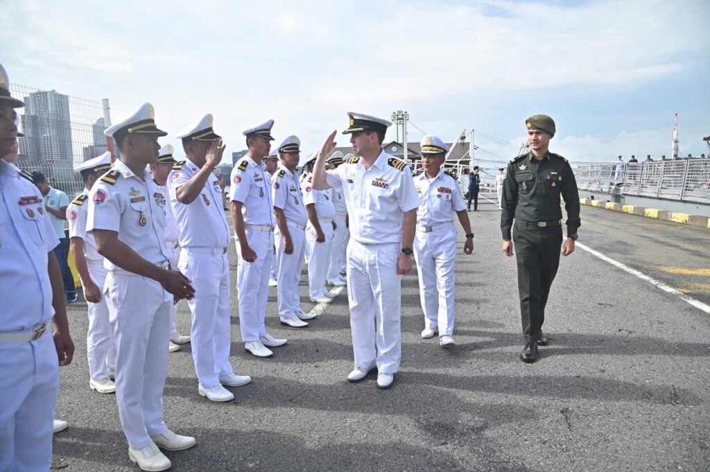លោកឧត្តមនាវីត្រី អ៉ិន សុខេមរ៉ា នាយសេនាធិការរង មូលដ្ឋានសមុទ្ររាម និងនាយនាវីជាច្រើនរូប អញ្ជើញទៅ ទទួលស្វាគមន៍នាវាកងទ័ពជើងទឹកអូស្ត្រាលី ចំនួន១គ្រឿង ឈ្មោះ នាវាHMAS Ballarat -FFH155 (Anzac Class FFH) ដឹកនាំដោយវរនាវីទោ Dean Uren មេបញ្ជាការនាវា នៅកំពង់ផែស្វយ័តក្រុងព្រះសីហនុ។