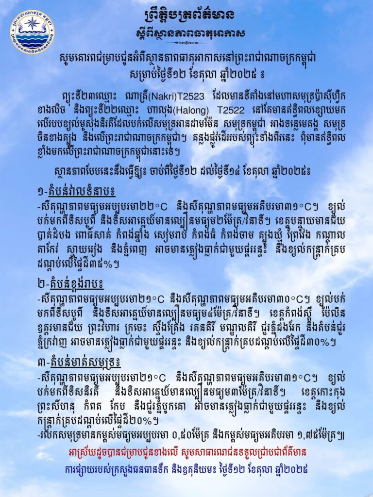 ភ្នំពេញ៖ក្រសួងធនធានទឹក និងឧតុនិយម បានចេញសេចក្តីជូនដំណឹង អំពីស្ថានភាពធាតុអាកាសនៅកម្ពុជា សម្រាប់ថ្ងៃទី១២ ខែតុលា ឆ្នាំ២០២៥។