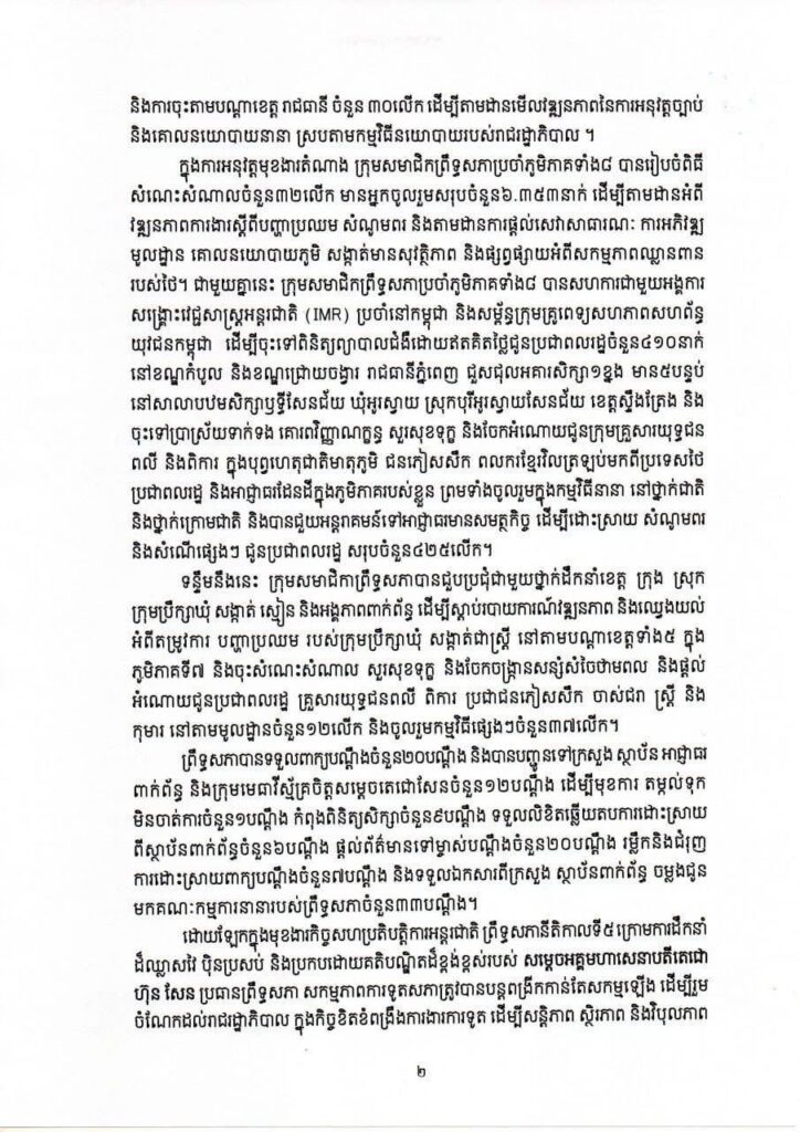 ក្នុងអំឡុងពេលបីខែនៃចន្លោះសម័យប្រជុំលើកទី៣ និងលើកទី៤ ព្រឹទ្ធសភានីតិកាលទី៥ (៧ កក្កដា-៦តុលា ២០២៥) ថ្នាក់ដឹកនាំ គណៈកម្មាធិការអចិន្ត្រៃយ៍ គណៈកម្មការ ក្រុមសមាជិក ព្រឹទ្ធសភាប្រចាំភូមិភាគទាំង៨ ក្រុមសមាជិកាព្រឹទ្ធសភា និងសមាជិក សមាជិកាព្រឹទ្ធសភា បានខិតខំ បំពេញការងារជាប្រក្រតីក្នុងព្រឹទ្ធសភា និងសកម្មក្នុងការចុះប្រាស្រ័យទាក់ទងជាមួយប្រជាពលរដ្ឋ និងអាជ្ញាធរដែនដីក្នុងភូមិភាគរបស់ខ្លួន ព្រមទាំងរួមចំណែកយ៉ាងសកម្មក្នុងការលើកកម្ពស់ស្មារតី រួមគ្នាជាធ្លុងមួយ សាមគ្គីភាព និងឯកភាពជាតិ តាមរយៈការឧបត្ថម្ភគាំទ្រ និងលើកទឹកចិត្តកងកម្លាំង វីរយុទ្ធជនការពារជាតិជួរមុខ និងជនភៀសសឹកនៅតាមបណ្តាខេត្តនៅព្រំដែន ដោយសម្រេចបាន លទ្ធផលផ្លែផ្កាជាគុណប្រយោជន៍ដល់ជាតិ និងប្រជាពលរដ្ឋ មានជាអាទិ៍៖