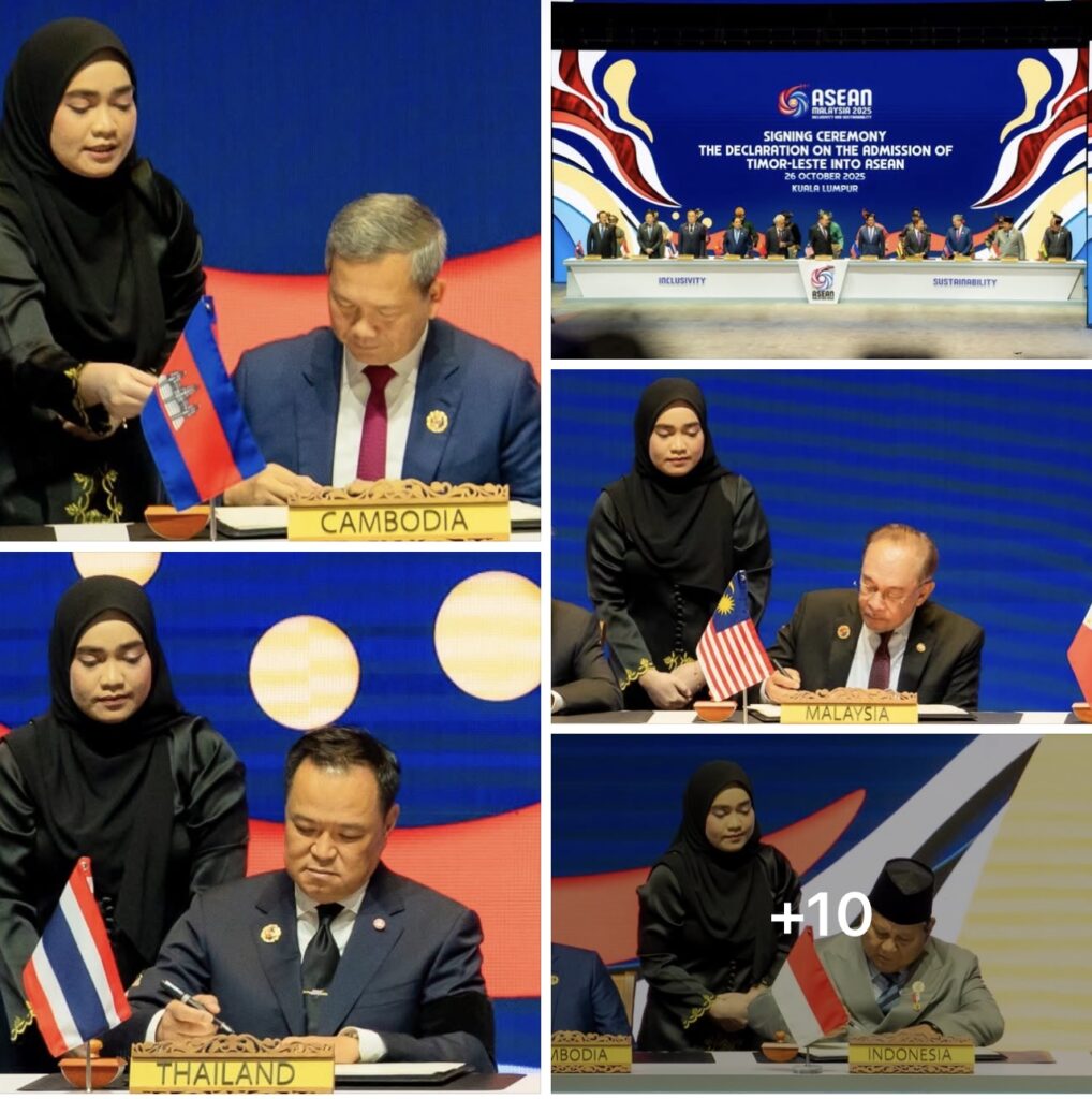 ម៉ាឡេស៊ី៖នៅព្រឹកថ្ងៃទី២៦ ខែតុលា ឆ្នាំ២០២៥ សម្តេចមហាបវរធិបតី ហ៊ុន ម៉ាណែត នាយករដ្ឋមន្ត្រីនៃព្រះរាជាណាចក្រកម្ពុជា រួមជាមួយថ្នាក់ដឹកនាំ នៃបណ្តាប្រទេសជាសមាជិកអាស៊ានចុះហត្ថលេខាលើសេចក្តីថ្លែងការណ៍ ស្តីពីការចូលជាសមាជិកអាស៊ានរបស់ប្រទេសទីម័រឡេស្តេ៕