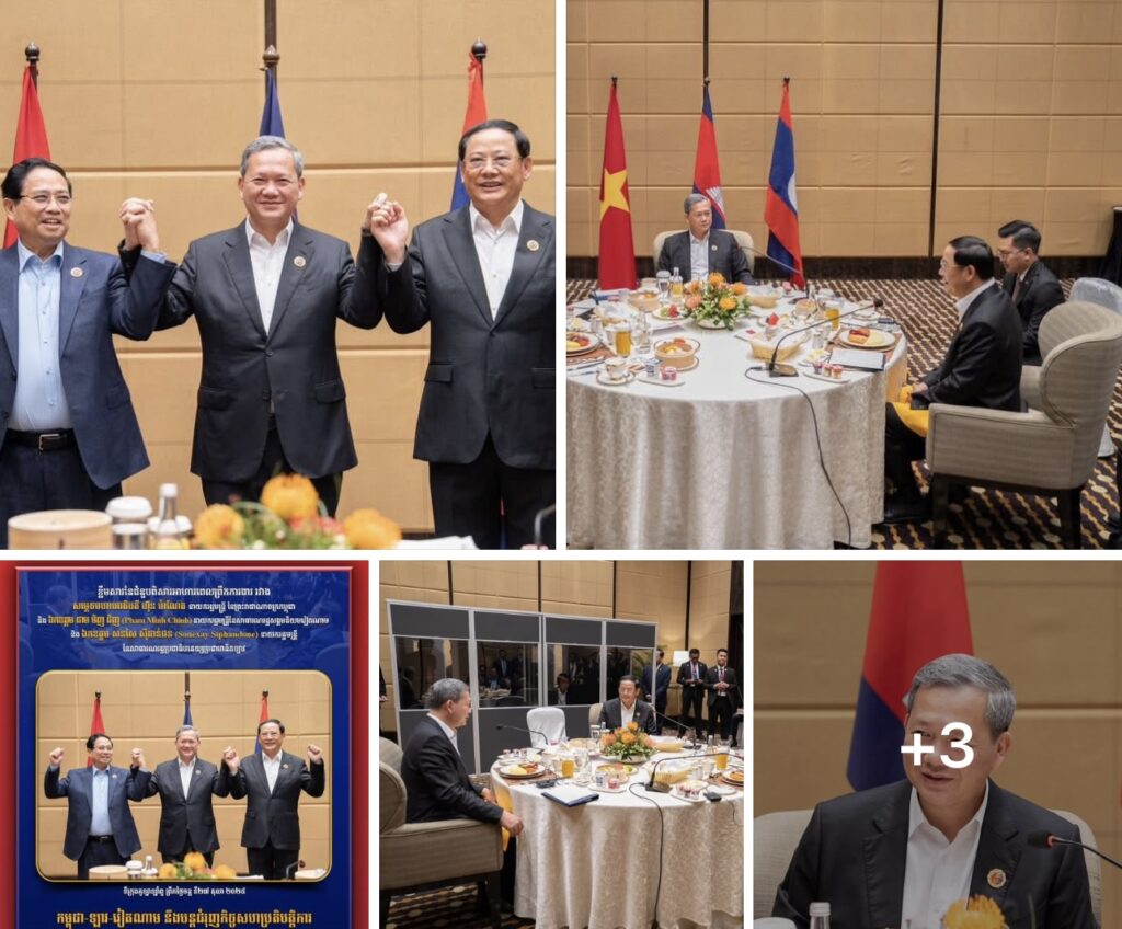 នាព្រឹកថ្ងៃទី២៧ ខែតុលា ឆ្នាំ២០២៥ សម្តេចមហាបវរធិបតី ហ៊ុន ម៉ាណែត នាយករដ្ឋមន្ត្រីកម្ពុជា បានរៀបចំអាហារការងារជាមួយលោក ផាម មិញ ជិញ នាយករដ្ឋមន្ត្រីវៀតណាម និងលោក សនសៃ ស៊ីផាន់ដន នាយករដ្ឋមន្ត្រីឡាវ។ ជំនួបពិសាអាហារការងារបានក្លាយទៅជាប្រពៃណីទៅហើយសម្រាប់មេដឹកនាំកម្ពុជា ឡាវ និងវៀតណាម។