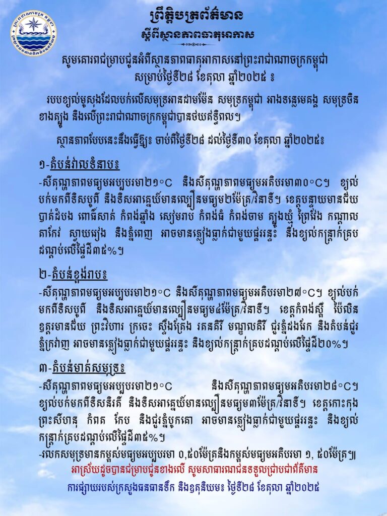 ភ្នំពេញ៖ក្រសួងធនធានទឹក និងឧតុនិយម បានចេញសេចក្តីជូនដំណឹង អំពីស្ថានភាពធាតុអាកាសនៅកម្ពុជា សម្រាប់ថ្ងៃទី២៨ ខែតុលា ឆ្នាំ២០២៥។