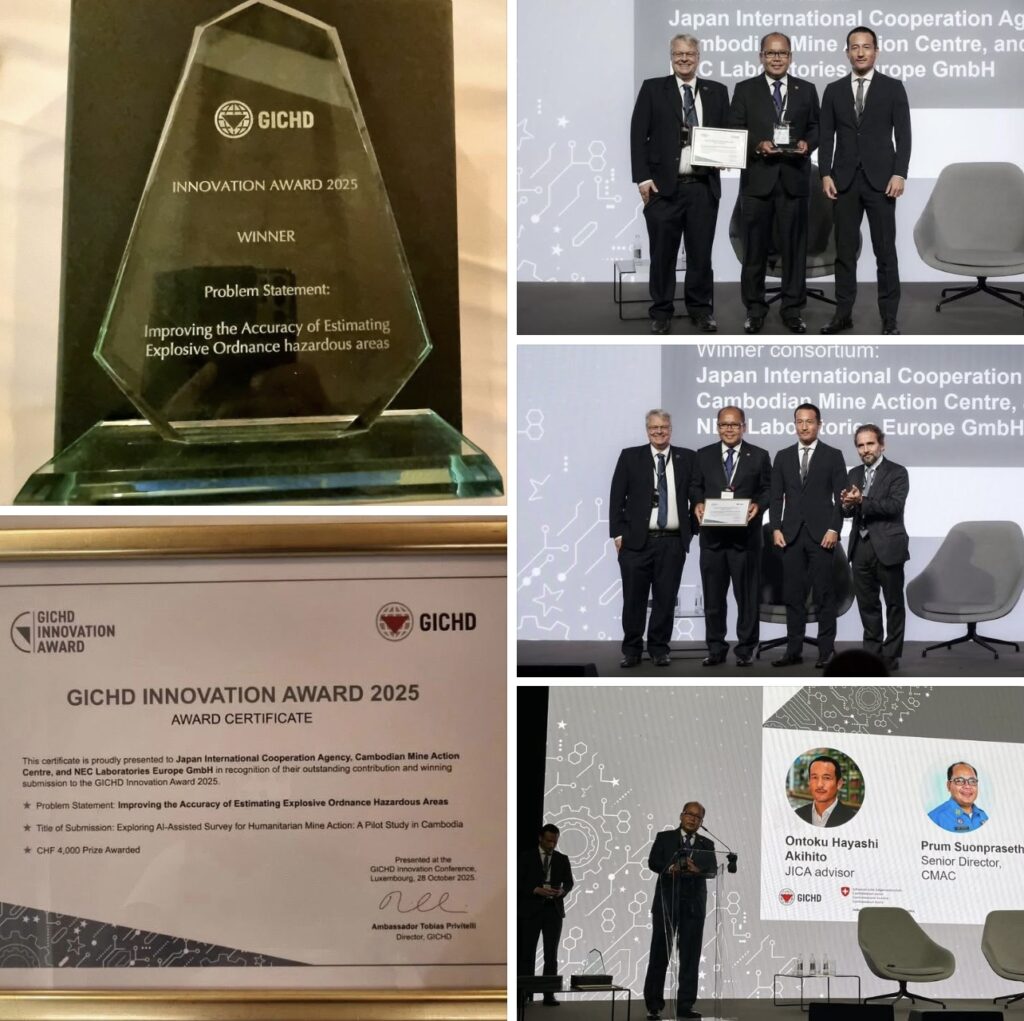 ពានរង្វាន់នេះ ធ្វើឡើងលើប្រធានបទ «ការបង្កើនភាពត្រឹមត្រូវ ក្នុងការកំណត់វាយតម្លៃ តំបន់ហានិភ័យគ្រាប់យុទ្ធភណ្ឌ» ដែលអង្គភាព CMAC បានផ្តួចផ្តើមបង្កើត និងអនុវត្តន៍ គម្រោងប្រព័ន្ធទិន្នន័យ បញ្ញាសិប្បនិម្មិត សម្រាប់គ្រប់គ្រងតំបន់រងផលប៉ះពាល់ សំណល់យុទ្ធភណ្ឌសង្គ្រាម (AI Database for the Explosive Remnants of War) ដោយទទួល បានគាំទ្រជំនួយហិរញ្ញប្បទានឥតសំណង ពីរដ្ឋាភិបាលជប៉ុន ផ្តល់ជូនរាជរដ្ឋាភិបាល និងបានអនុវត្តដោយអង្គភាព CMAC និងផ្តល់ការងារបច្ចេកទេសពីក្រុមហ៊ុន NEC ព្រមទាំង JICA៕