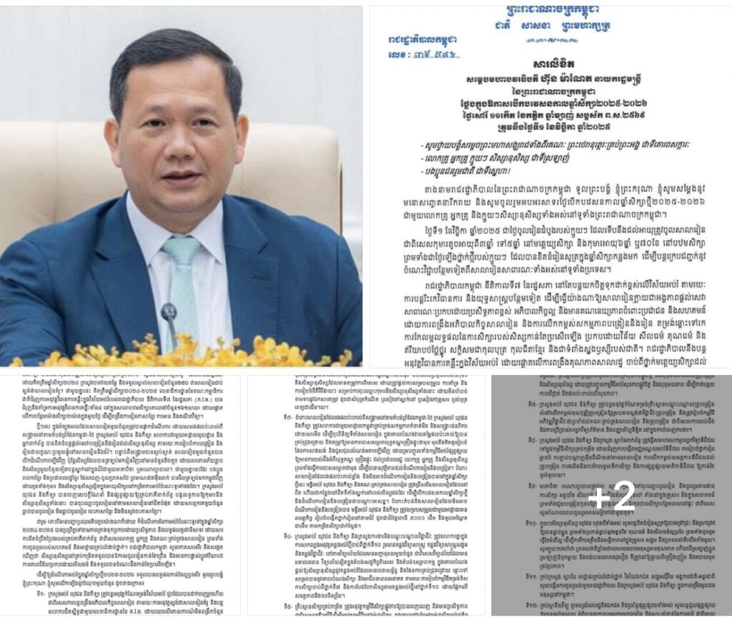 ភ្នំពេញសម្តេចមហាបវរធិបតី ហ៊ុន ម៉ាណែត នាយករដ្ឋមន្ត្រី នៃកម្ពុជា បានចេញសារលិខិតថ្លែងអបអរសាទរ ក្នុងឱកាសបើកបវេសនកាលឆ្នាំសិក្សា២០២៥-២០២៦ ថ្ងៃសៅរ៍ ១១កើត ខែកត្តិក ឆ្នាំម្សាញ់ សប្តស័ក ព.ស.២៥៦៩ ត្រូវនឹងថ្ងៃទី១ ខែវិច្ឆិកា ឆ្នាំ២០២៥៕