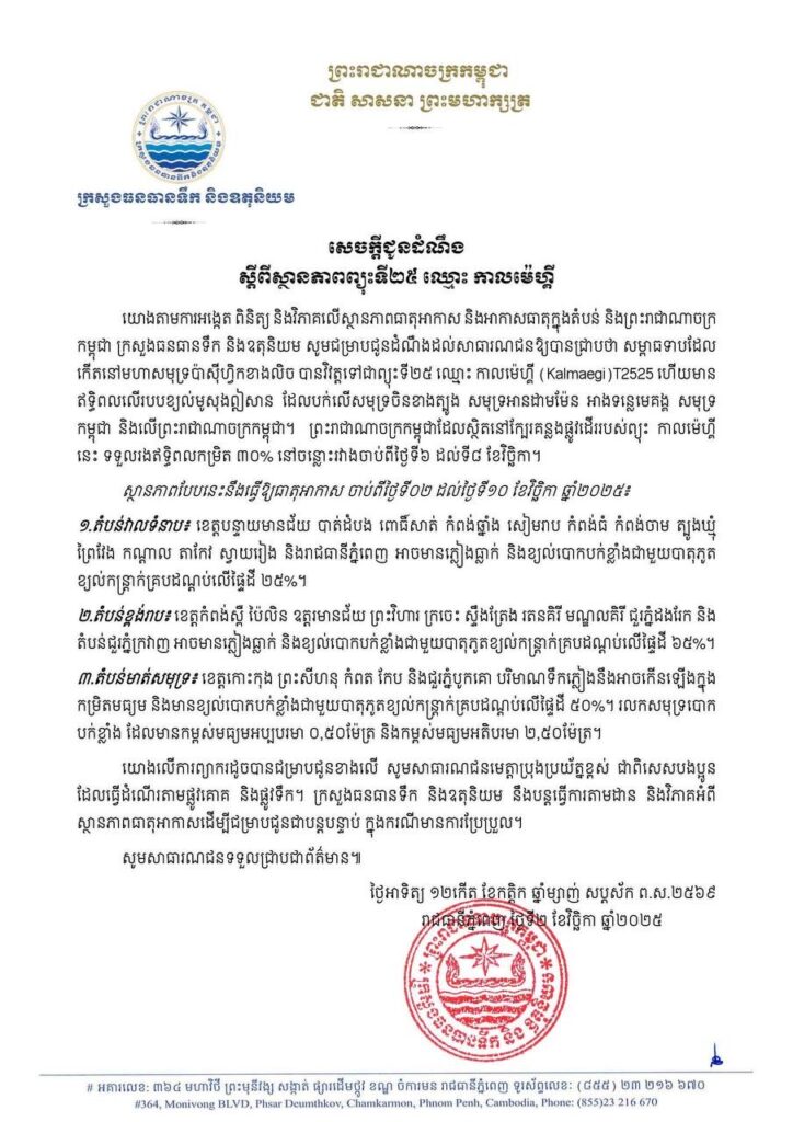 ភ្នំពេញ៖ក្រសួងធនធានទឹក និងឧតុនិយម នាថ្ងៃទី២ ខែវិច្ឆិកា ឆ្នាំ២០២៥នេះ បានឱ្យដឹងថា កម្ពុជានឹងទទួលរងឥទ្ធិពលកម្រិត៣០% ពីព្យុះ កាលម៉េហ្គី នៅចន្លោះរវាងចាប់ពីថ្ងៃទី៦ ដល់ទី៨ ខែវិច្ឆិកា ដែលករណីនេះ នឹងធ្វើឱ្យមានភ្លៀងធ្លាក់ និងខ្យល់បោកបក់ខ្លាំង ពីថ្ងៃទី២ដល់ថ្ងៃទី១០ខែវិច្ឆិកា នៅទូទាំងប្រទេស។