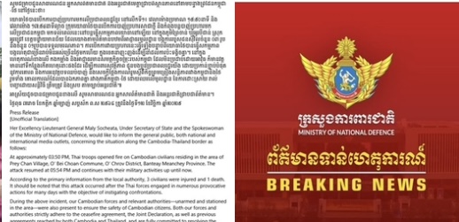 ភ្នំពេញ៖លោកជំទាវឧត្តមសេនីយ៍ឯក ម៉ាលី សុជាតា អ្នកនាំពាក្យក្រសួងការពារជាតិកម្ពុជា បានអះអាងថា នៅថ្ងៃទី១២ ខែវិច្ឆិកា ឆ្នាំ២០២៥នេះ យោធាថៃ បានបើកការបាញ់ប្រហារមកលើប្រជាពលរដ្ឋខ្មែរ នៅភូមិព្រៃចាន់ ឃុំអូរបីជាន់ ស្រុកអូរជ្រៅ ខេត្តបន្ទាយមានជ័យ ចំនួន២លើក ដែលមកទល់ពេលនេះ នៅបន្តធ្វើសកម្មភាពយោធានៅឡើយ។