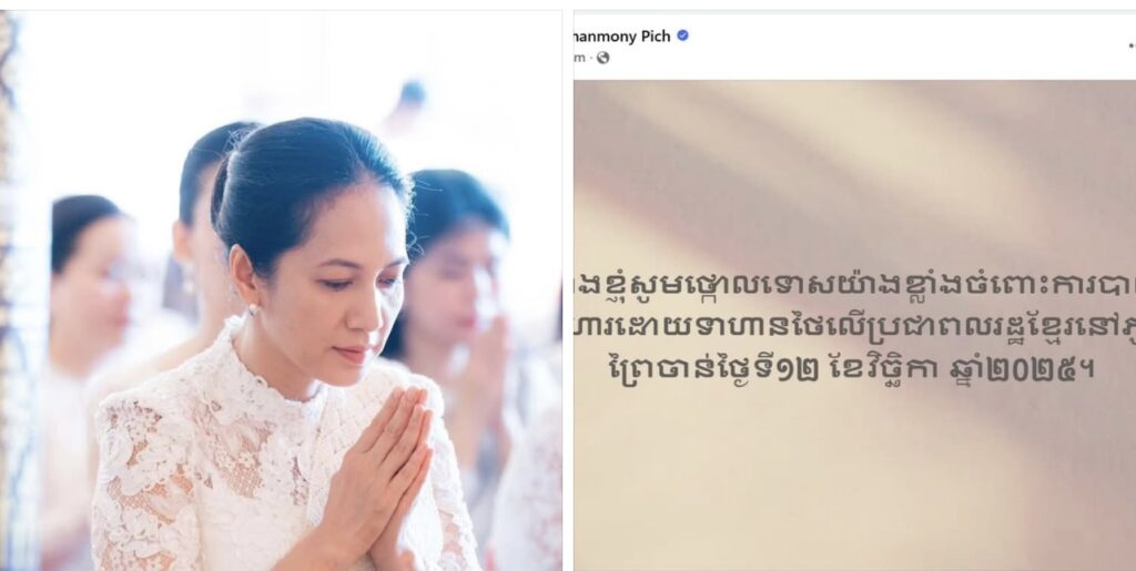 លោកជំទាវបណ្ឌិត ពេជ ចន្ទមុន្នី ហ៊ុនម៉ាណែត បានសរសេរយ៉ាងដូច្នេះថា «នាងខ្ញុំសូមថ្កោលទោសយ៉ាងខ្លាំង ចំពោះការបាញ់ប្រហារដោយទាហានថៃ លើប្រជាពលរដ្ឋខ្មែរ ថ្ងៃទី១២ ខែវិច្ឆិកា ឆ្នាំ២០២៥»